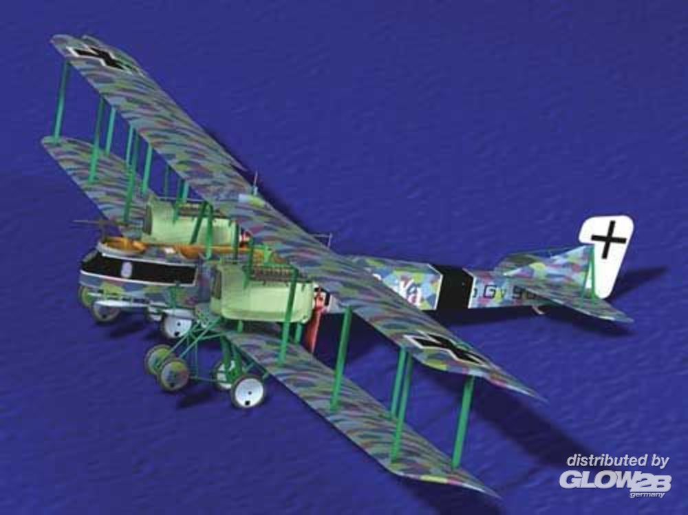 Fein detaillierter Bausatz mit Decals für Tarnstoff (Lozengetarnung). Baubar in 3 Markierungsvarianten, alle von der Bogohl 3: 904/16, "Erika", 1918 (Wie Deckelbild), 947/16, 1918, 906/16, 1917. Der Gotha G V war ein ab 1916 in Serie gebauter, vorwiegend gegen England eingesetzter, strategischer Bomber. Eine Besonderheit war der nach hinten unten teilweise offene Rumpf, damit ein Schusskanal für das obere hintere MG die Abwehr von Jägern im sonst toten Winkel des Bombers ermöglichte.