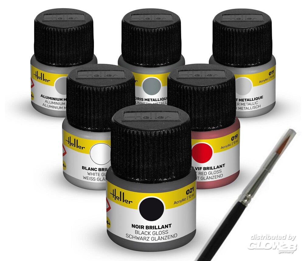 Dieses Set enthält sechs Acryl-Farben mit 12 ml Inhalt und einen Pinsel. Enthaltene Farben: