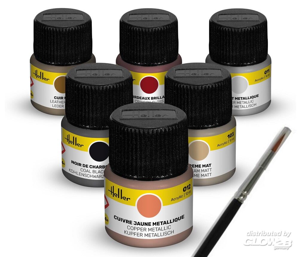 Dieses Set enthält sechs Acryl-Farben mit 12 ml Inhalt und einen Pinsel. Enthaltene Farben: