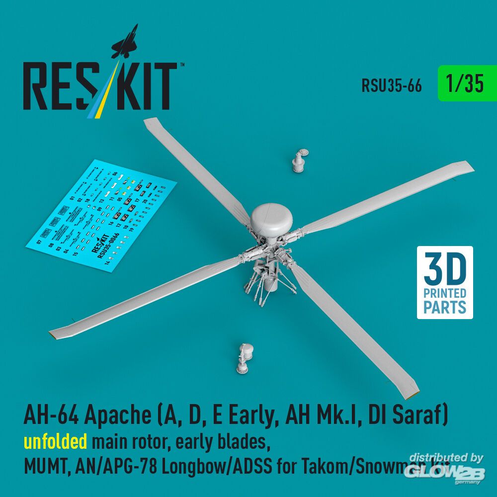 RESKIT Models: AH-64 Apache (A, D, E Early, AH Mk.I, DI Saraf) unfolded main rotor, early blades, MUMT, AN/APG-78 Longbow/ADSS for Takom/Snowman kit (3D Printed) in 1:35 [4592200664]
