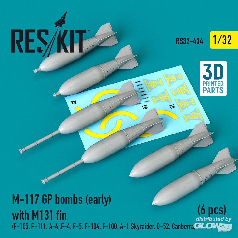ResKit Models: M-117 GP bombs (early) with M131 fin (6 pcs) (F-105, F-111, A-4 ,F-4, F-5, F-104, F-100, A-1 Skyraider, B-52, Canberra) (3D Printed) in 1:32 [4593104343]