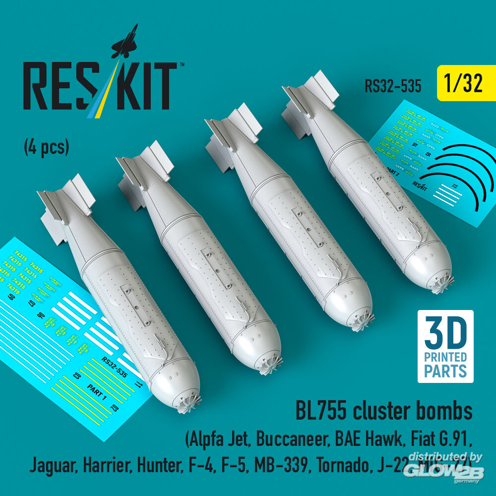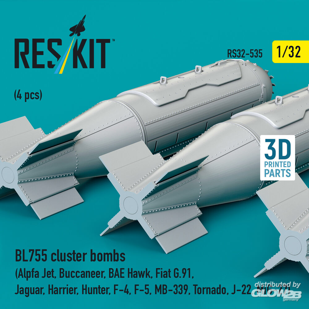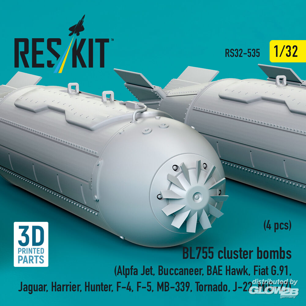 ResKit Models: BL755 cluster bombs (4 pcs) (Alpfa Jet, Buccaneer, BAE Hawk, Fiat G.91, Jaguar, Harrier, Hunter, F-4, F-5, MB-339, Tornado, J-22, MiG-27) (3D Printed) in 1:32 [4593105357]