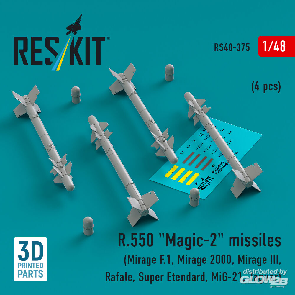 ResKit Models: R.550 Magic-2 missiles (4 pcs) (Mirage F.1, Mirage 2000, Mirage III, Rafale, Super Etendard, MiG-21, Jaguar) (3D Printed) in 1:48 [4594103758]
