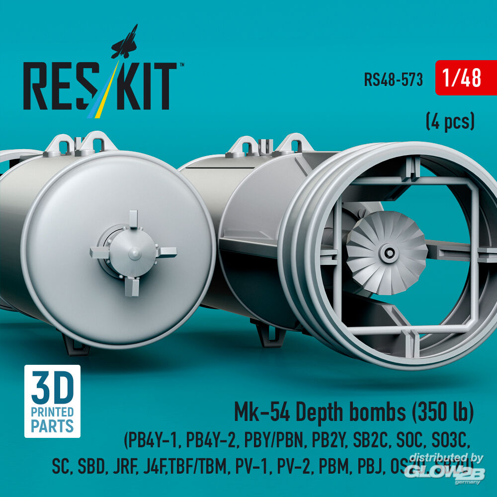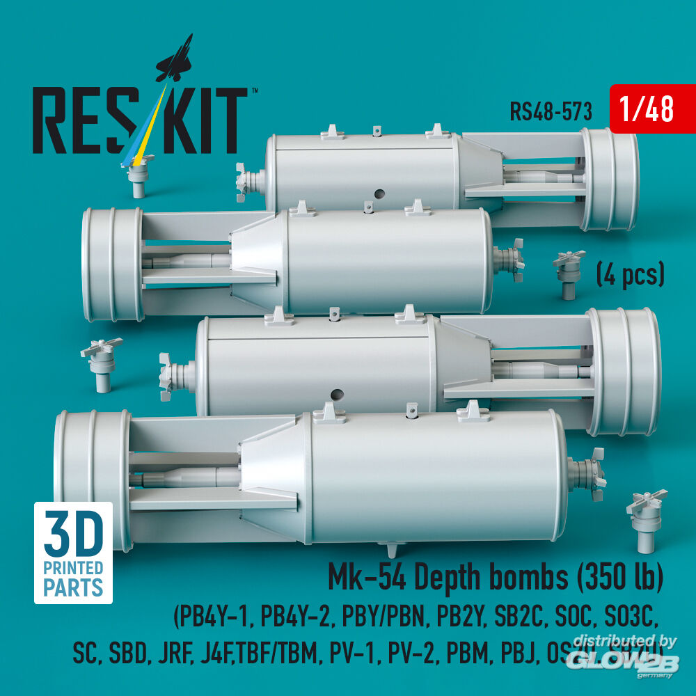 ResKit Models: Mk-54 Depth bombs (350 lb) (4 pcs) (PB4Y-1, PB4Y-2, PBY/PBN, PB2Y, SB2C, SOC, SO3C, SC, SBD, JRF, J4F, TBF/TBM, PV-1, PV-2, PBM, PBJ, OS2U, SB2U) (3D Printed) in 1:48 [4594105738]