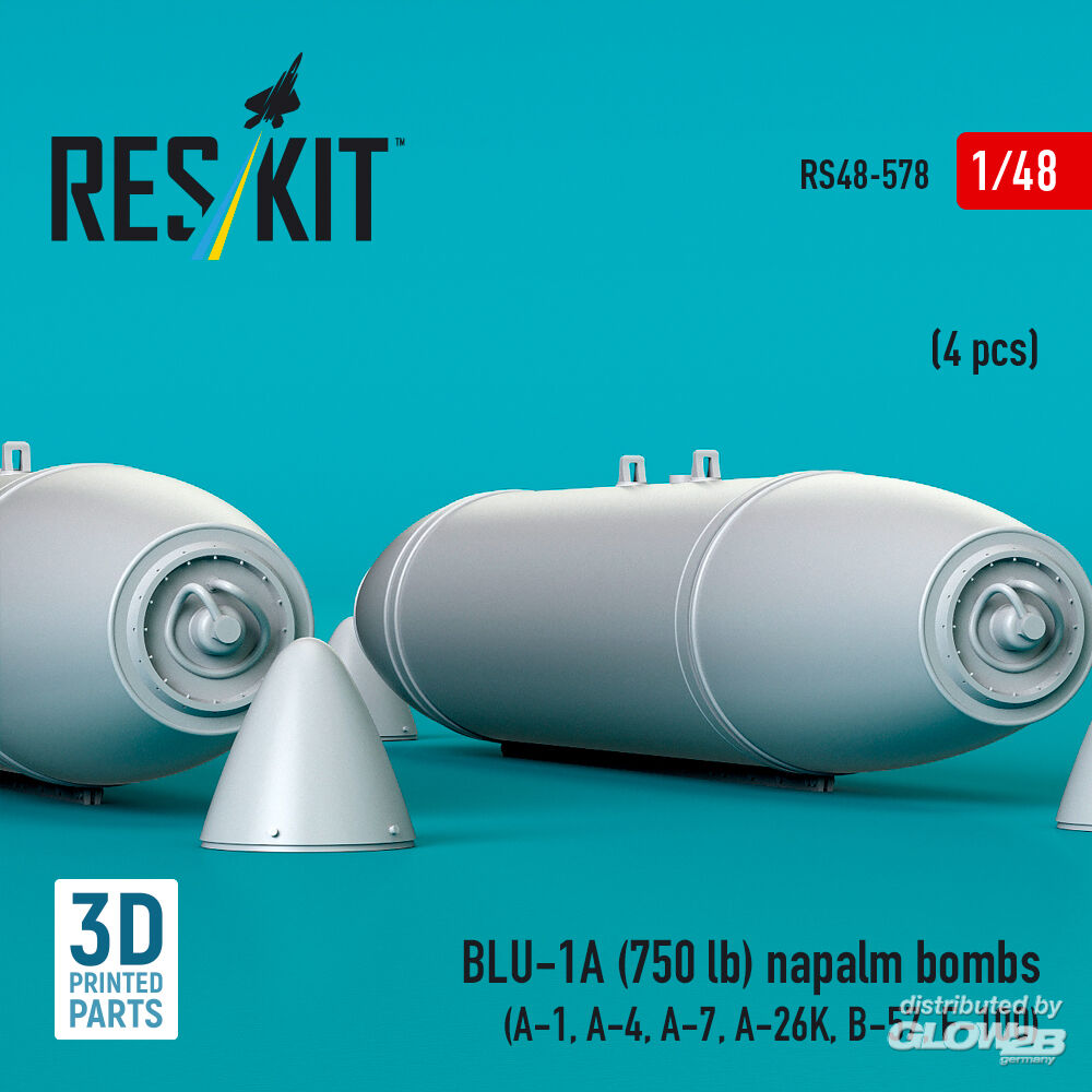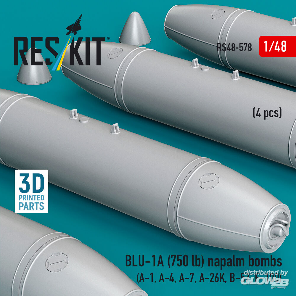 ResKit Models: BLU-1A (750 lb) napalm bombs (4 pcs) (A-1, A-4, A-7, A-26K, B-57, F-100) (3D Printed) in 1:48 [4594105783]