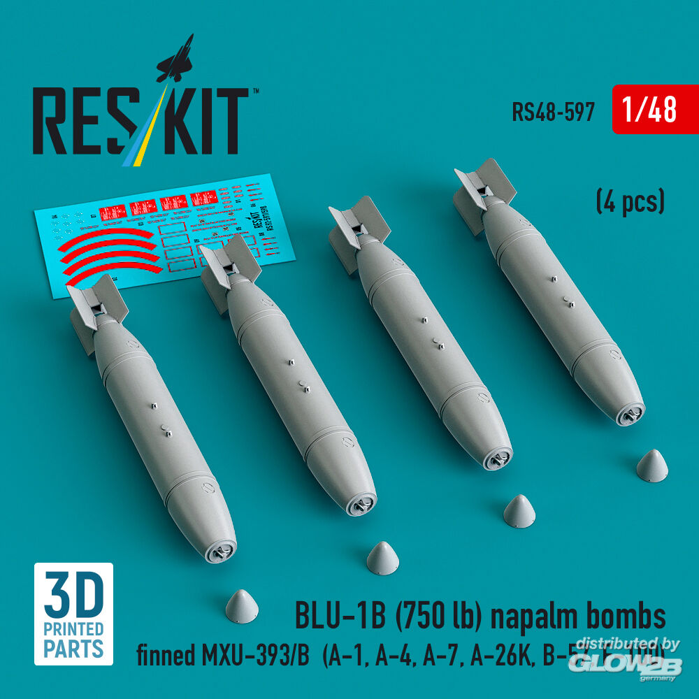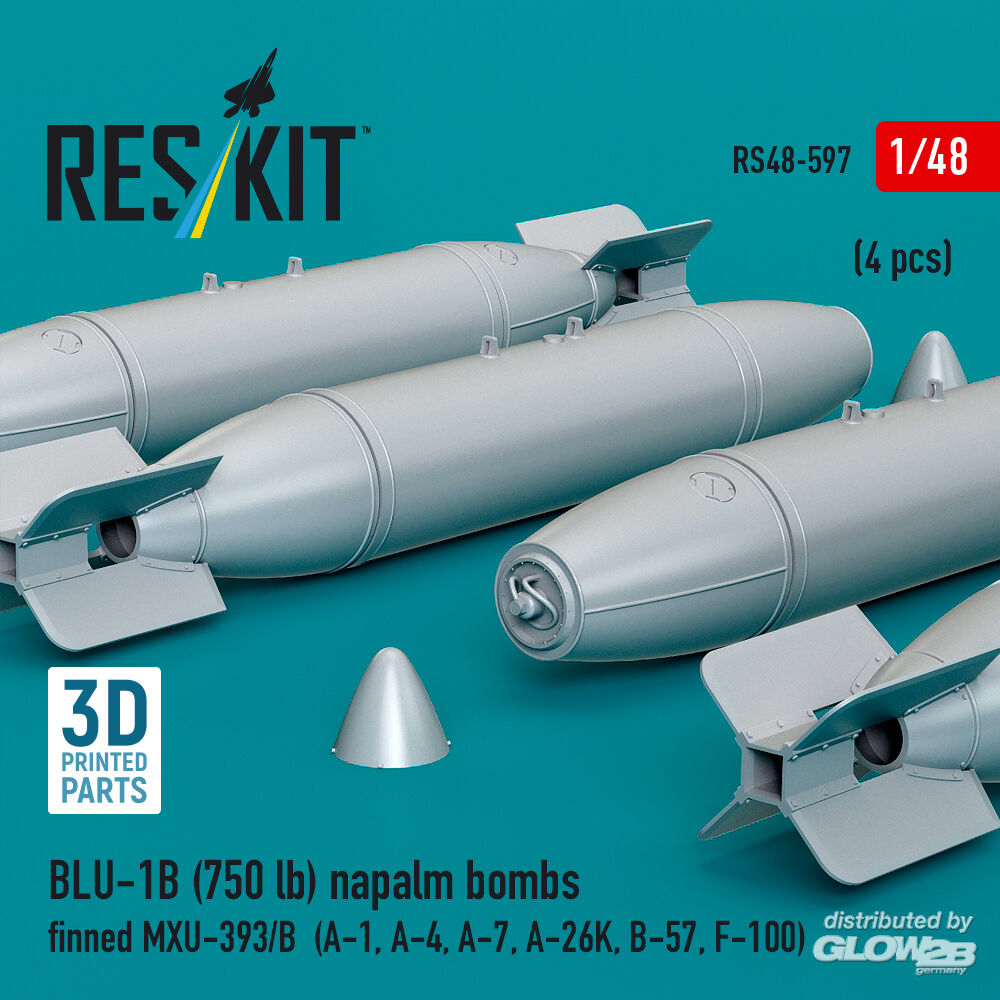 ResKit Models: BLU-1B (750 lb) napalm bombs finned MXU-393/B (4 pcs) (A-1, A-4, A-7, A-26K, B-57, F-100) (3D Printed) in 1:48 [4594105974]