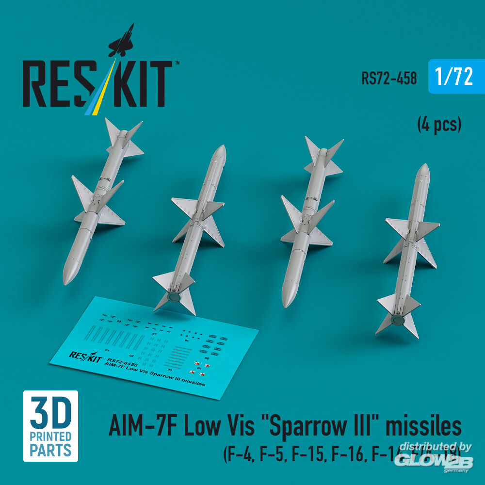 RESKIT Models: AIM-7F Low Vis Sparrow III missiles (4 pcs) (F-4, F-5, F-15, F-16, F-14, F/A-18) (3D Printed) in 1:72 [4595104587]
