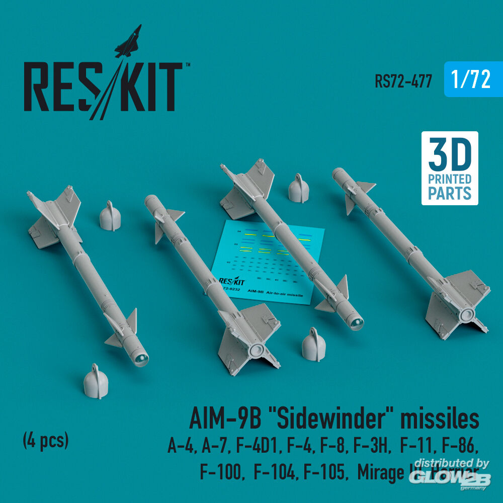 RESKIT Models: AIM-9B Sidewinder missiles (4 pcs) (A-4, A-7, F-4D1, F-4, F-8, F-3H, F-11, F-86,F-100, F-104, F-105, Mirage III, Harrier) (3D Printed) in 1:72 [4595104778]