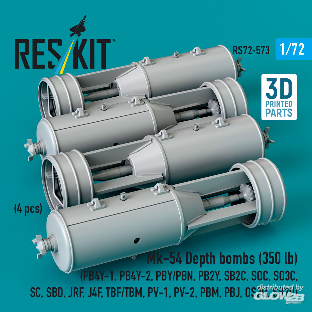 RESKIT Models: Mk-54 Depth bombs (350 lb) (4 pcs) (PB4Y-1, PB4Y-2, PBY/PBN, PB2Y, SB2C, SOC, SO3C, SC, SBD, JRF, J4F, TBF/TBM, PV-1, PV-2, PBM, PBJ, OS2U, SB2U) (3D Printed) in 1:72 [4595105737]