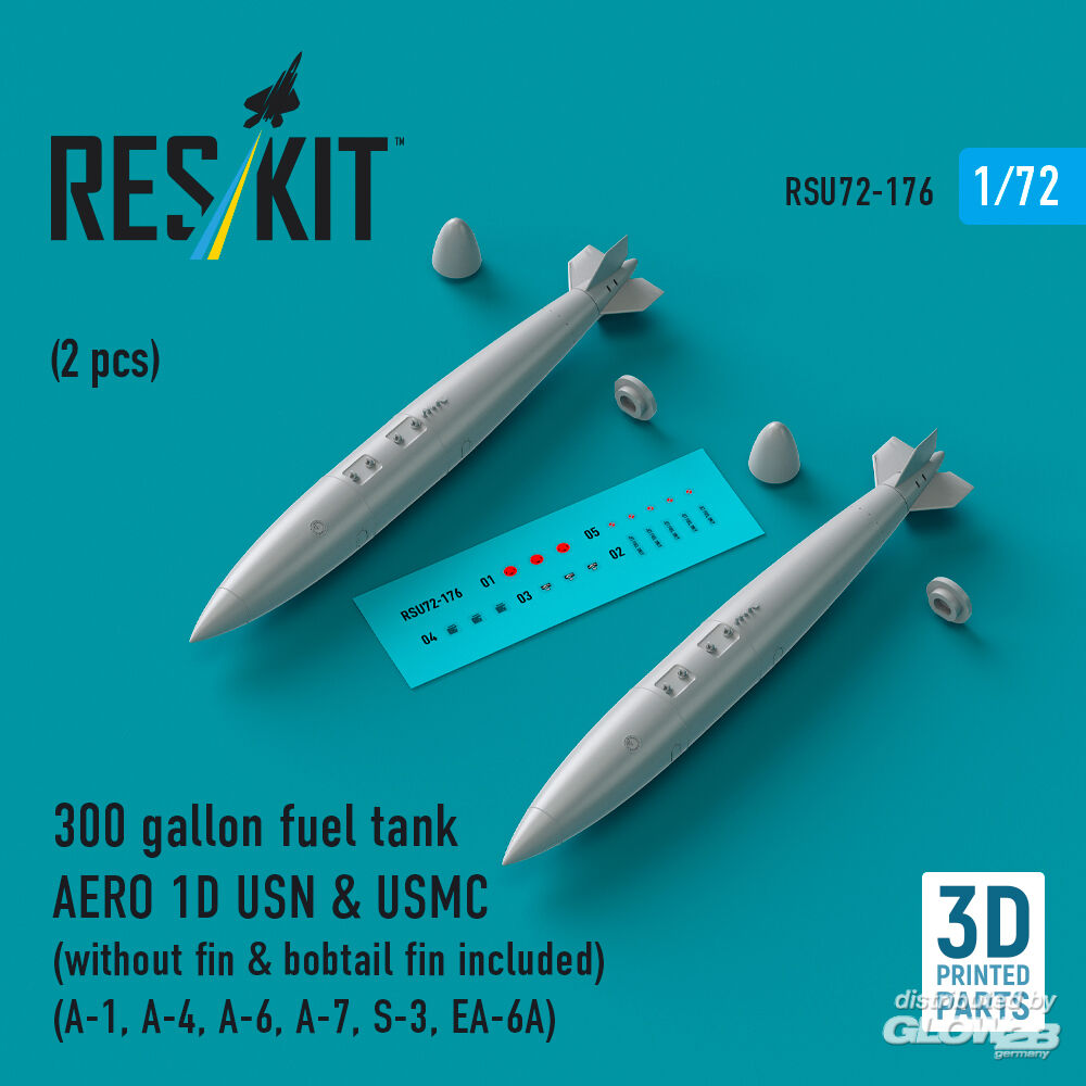 RESKIT Models: 300 gallon fuel tank AERO 1D USN & USMC (without fin & bobtail fin included) (2 pcs) (A-1, A-4, A-6, A-7, S-3, EA-6A) (3D Printed) in 1:72 [4595201767]