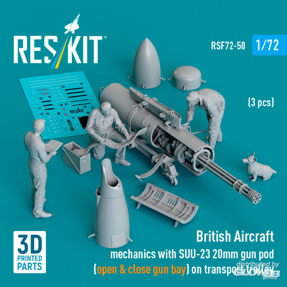 RESKIT Models: British Aircraft mechanics with SUU-23 20mm gun pod (open & close gun bay) on transport trolley (scene 1) (3 pcs) (3D Printed) in 1:72 [4595400504]