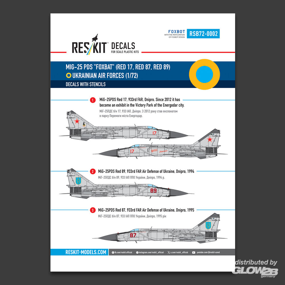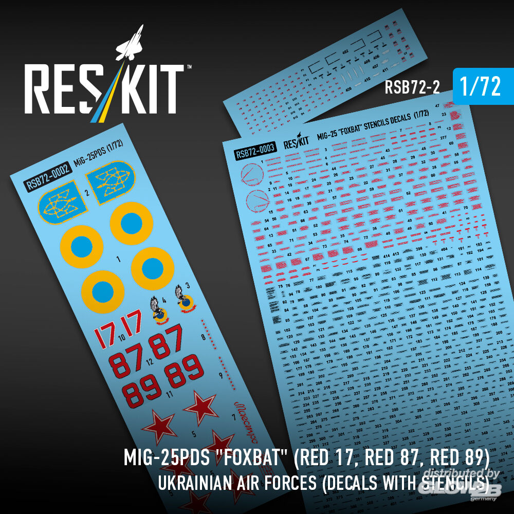 RESKIT Models: MiG-25PDS Foxbat (Red 17, Red 87, Red 89) Ukrainian Air Forces (Decals with Stencils) in 1:72 [4595800021]