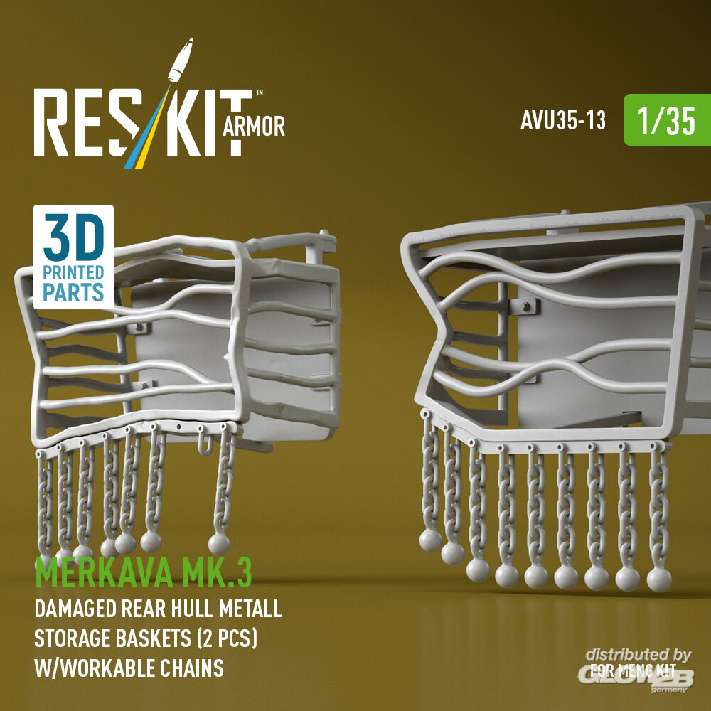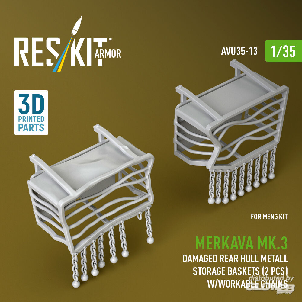RESKIT Models: Merkava Mk.3 damaged rear hull metall storage baskets (2 pcs) w/workable chains for Meng kit (3D Printed) in 1:35 [4712100133]
