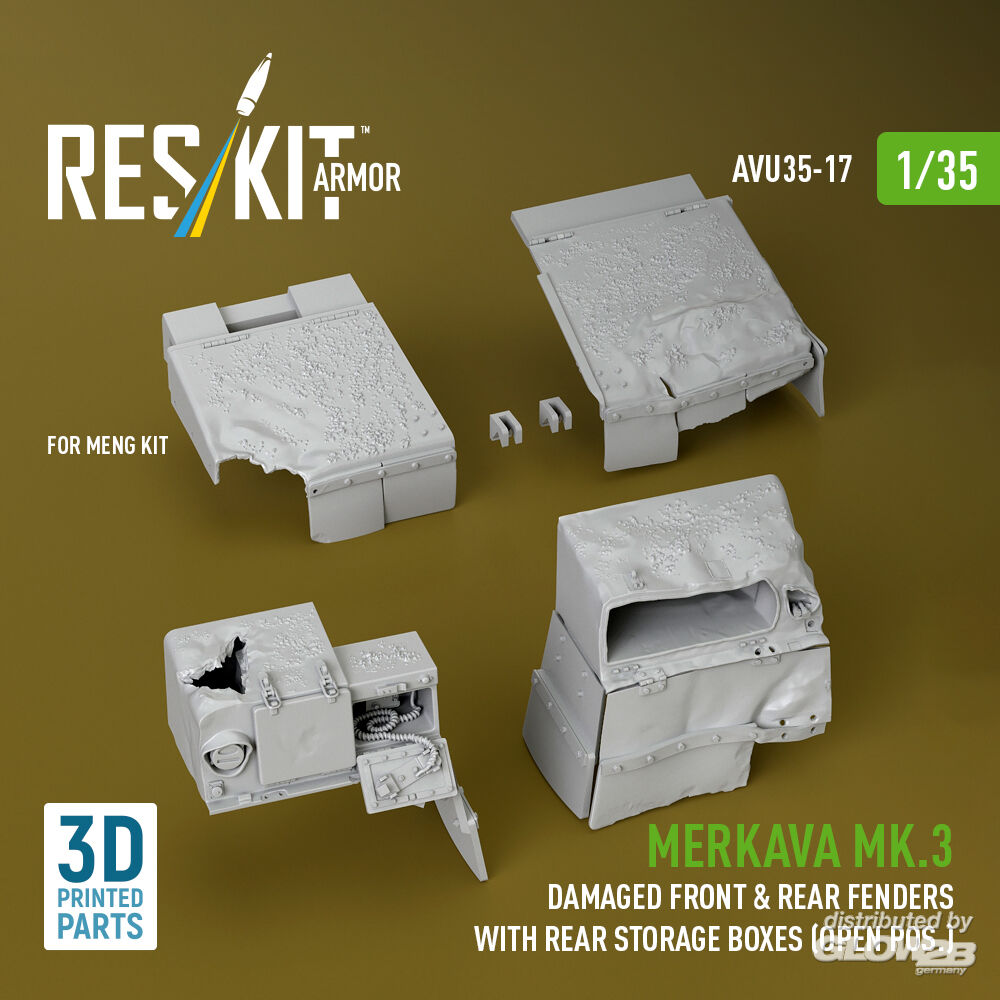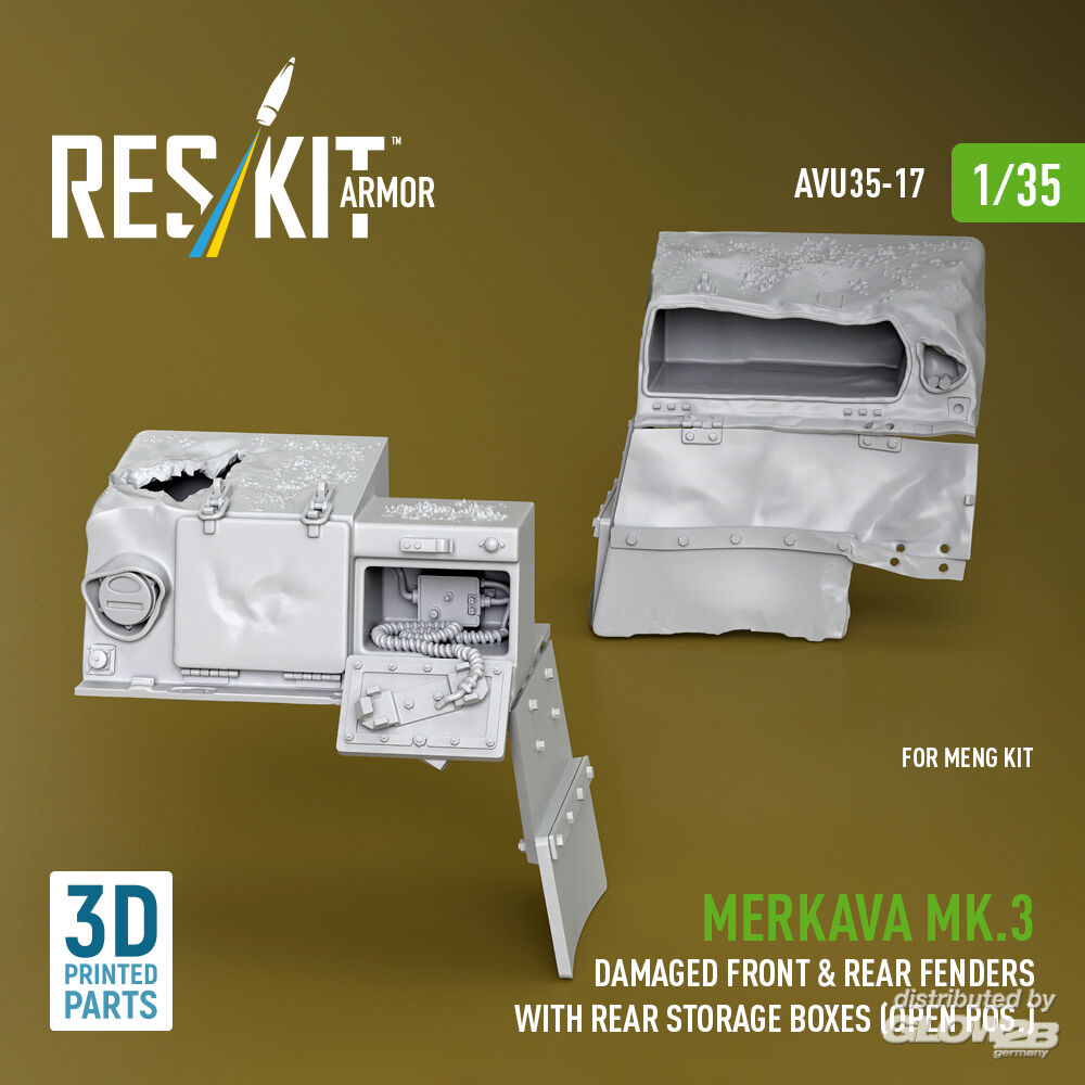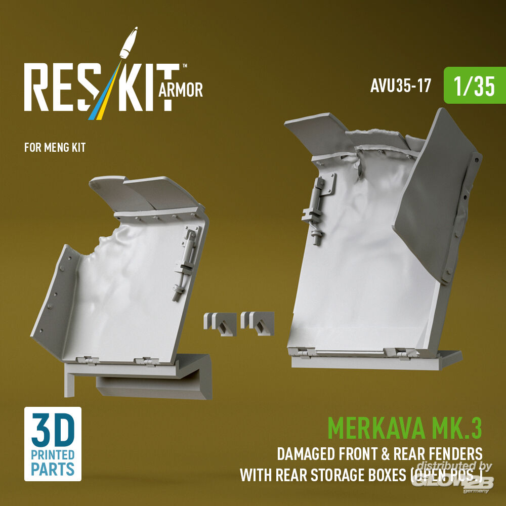 RESKIT Models: Merkava Mk.3 damaged front & rear fenders with rear storage boxes (open pos.) for Meng kit (3D Printed) in 1:35 [4712100171]