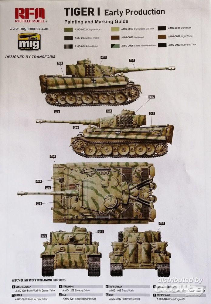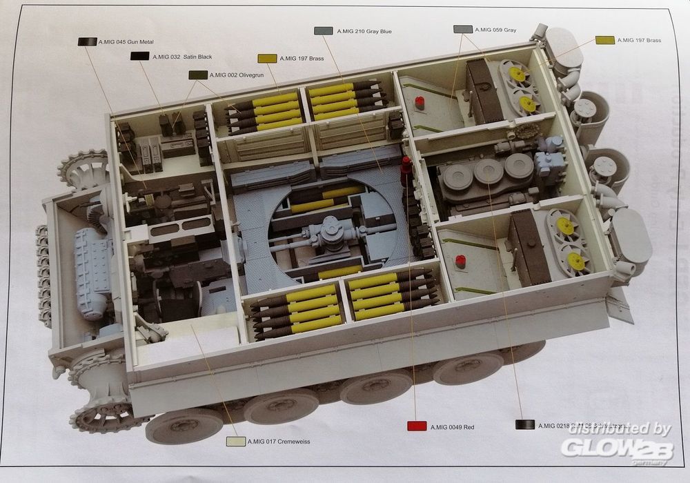 - No. S04, sPzAbt 101, Russia, January 1944 - No. 1331, 1st Panzer Division 1943 mit detailliertem Interior, Ätzteilen, Draht als Abschleppseil, Decals, Einzelglieder Ketten und Klarteilen. Der Turm und die Abdeckung des Innenraums kann wahlweise auch mit klarem Kunststoff gebaut werden, so daß die komplette Inneneinrichtung gesehen werden kann. Tiger I - No. S04, sPzAbt 101, Russia, January 1944 - No. 1331, 1st Panzer Division 1943 with detailed interior, etched parts, wire as tow rope, decals, workable track links chains and clear parts.The tower and the cover of the interior can be optionally built with clear plastic, so that the entire interior can be seen. Zusatzinformationen