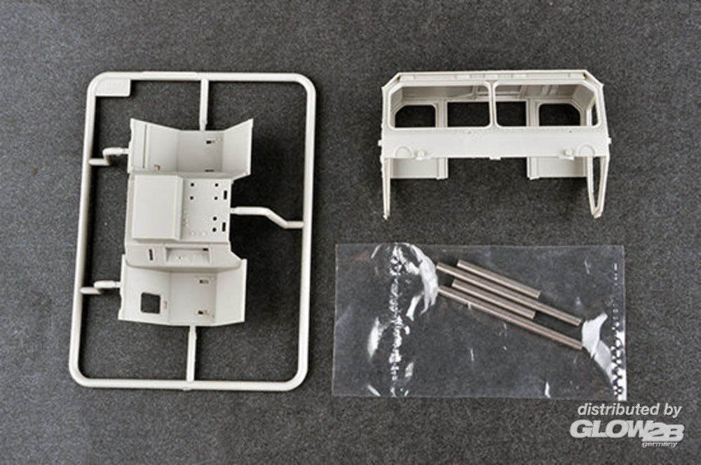 - Antriebsstrang komplett mit Motorgetriebe, Differentialgehäuse und Federung. - Die Reifen sind Hohlgummi mit sehr gutem Profil - Die Windschutzscheibe und die Seitenfenster bestehen aus klaren Teilen - Fotoätzteile enthalten - Container enthalten Detailed cab. > Full drive train assembly complete with engine transmission, differential housing and suspension units. > The main tires are hollow rubber with very good tread pattern > The windshield and side windows are made of clear parts. > Photo-etched parts included > Container included Zusatzinformationen