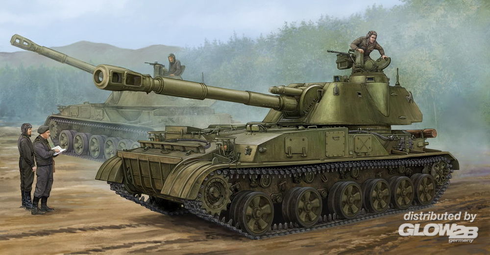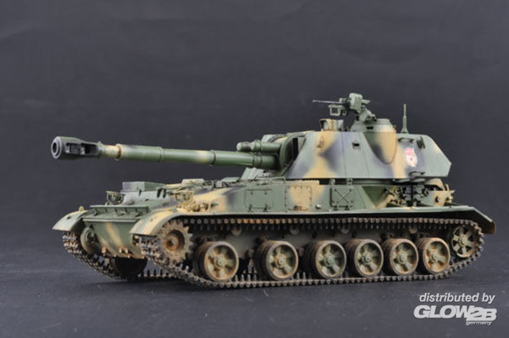 Driver's and engine-transmission compartments are located in a front part of a hull, fighting compartment with rotatory turret - in middle and rear parts of the hull. The armour is welded rolled steel. Howitzer is equipped with R-123 radio set, R-124 intercom, automatic NBC system with filtration unit and fire-fighting equipment. The V-59 12-cylinder four stroke water-cooled diesel engine connects with a mechanical twin gear transmission, a gear box is in one block with a planetary steering gear. SO-152 has self-entrenching equipment which allows to prepare a trench within 20-40 min. The crew consists of 4-6 men: a driver, a gunner, a loader, a commander, and two ammunition bearers, which are positioned to the rear of the vehicle feeding rounds through two hatches in the hull rear when in masked firing position. More Features - The kit consists of over 530 parts - the kit w/refined detail - multi-slide moulded turret, upper hull and lower hull - 240 individual tracks links Zusatzinformationen