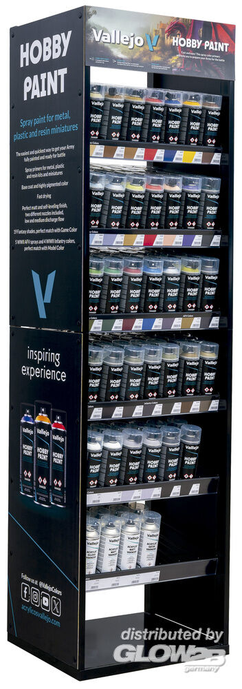 Inhalt: 6 x PANZER GREY HOBBY PAINT IN SPRAY 02 - 400ML. (Vallejo 28002 / Glow2B 9551280020) 6 x RUSSIAN GREEN 4BO HOBBY PAINT IN SPRAY 03 - 400ML. (Vallejo 28003 / Glow2B 9551280037) 6 x UK BRONZE GREEN HOBBY PAINT IN SPRAY 04 - 400ML. (Vallejo 28004 / Glow2B 9551280044) 6 x US OLIVE DRAB HOBBY PAINT IN SPRAY 05 - 400ML. (Vallejo 28005 / Glow2B 9551280051) 6 x GERMAN FIELD GREY HOBBY PAINT IN SPRAY 06 - 400ML. (Vallejo 28006 / Glow2B 9551280068) 6 x RUSSIAN UNIFORM HOBBY PAINT IN SPRAY 07 - 400ML. (Vallejo 28007 / Glow2B 9551280075) 6 x ENGLISH UNIFORM HOBBY PAINT IN SPRAY 08 - 400ML. (Vallejo 28008 / Glow2B 9551280082) 6 x US KHAKI HOBBY PAINT IN SPRAY 09 - 400ML. (Vallejo 28009 / Glow2B 9551280099) 6 x WHITE HOBBY PAINT IN SPRAY 010-400ML (Vallejo 28010 / Glow2B 9551280105) 6 x GREY HOBBY PAINT IN SPRAY 011-400ML. (Vallejo 28011 / Glow2B 9551280112) 6 x BLACK HOBBY PAINT IN SPRAY 012-400ML. (Vallejo 28012 / Glow2B 9551280129) 6 x BONEWHITE HOBBY PAINT IN SPRAY 013 - 400ML. (Vallejo 28013 / Glow2B 9551280136) 6 x LEATHER BROWN HOBBY PAINT IN SPRAY 014 - 400ML. (Vallejo 28014 / Glow2B 9551280143) 6 x DESERT YELLOW HOBBY PAINT IN SPRAY 015 - 400ML. (Vallejo 28015 / Glow2B 9551280150) 6 x SCARLET RED HOBBY PAINT IN SPRAY 016 - 400ML. (Vallejo 28016 / Glow2B 9551280167) 6 x ULTRAMARINE BLUE HOBBY PAINT IN SPRAY 017 - 400ML. (Vallejo 28017 / Glow2B 9551280174) 6 x SUN YELLOW HOBBY PAINT IN SPRAY 018 - 400ML. (Vallejo 28018 / Glow2B 9551280181) 6 x BEASTY BROWN HOBBY PAINT IN SPRAY 019 - 400ML. (Vallejo 28019 / Glow2B 9551280198) 6 x WOLF GREY HOBBY PAINT IN SPRAY 020 - 400ML. (Vallejo 28020 / Glow2B 9551280204) 6 x SILVER HOBBY PAINT IN SPRAY 021 - 400ML. (Vallejo 28021 / Glow2B 9551280211) 6 x DEAD FLESH HOBBY PAINT IN SPRAY 022 - 400ML. (Vallejo 28022 / Glow2B 9551280228) 6 x BLOODY RED HOBBY PAINT IN SPRAY 023 - 400ML. (Vallejo 28023 / Glow2B 9551280235) 6 x PALE FLESH 024 HOBBY PAINT IN SPRAY 024 - 400ML. (Vallejo 28024 / Glow2B 9551280242) 6 x ALIEN PURPLE HOBBY PAINT IN SPRAY 025 - 400ML. (Vallejo 28025 / Glow2B 9551280259) 6 x DARK GREEN HOBBY PAINT IN SPRAY 026 - 400ML. (Vallejo 28026 / Glow2B 9551280266) 6 x GOBLIN GREEN HOBBY PAINT IN SPRAY 027 - 400ML. (Vallejo 28027 / Glow2B 9551280273) 6 x SICK GREEN HOBBY PAINT IN SPRAY 028 - 400ML. (Vallejo 28028 / Glow2B 9551280280) 6 x GORY RED HOBBY PAINT IN SPRAY 029 - 400ML. (Vallejo 28029 / Glow2B 9551280297) 6 x MAGIC BLUE HOBBY PAINT IN SPRAY 030 - 400ML. (Vallejo 28030 / Glow2B 9551280303) 6 x GUNMETAL HOBBY PAINT IN SPRAY 031 - 400ML. (Vallejo 28031 / Glow2B 9551280310) 6 x AEROSOL GLOSS VARNISH 530-400ML. (Vallejo 28530 / Glow2B 9551285308) 6 x AEROSOL MATT VARNISH 531-400ML. (Vallejo 28531 / Glow2B 9551285315) 6 x AEROSOL SATIN VARNISH 532-400ML. (Vallejo 28532 / Glow2B 9551285322) Zusatzinformationen