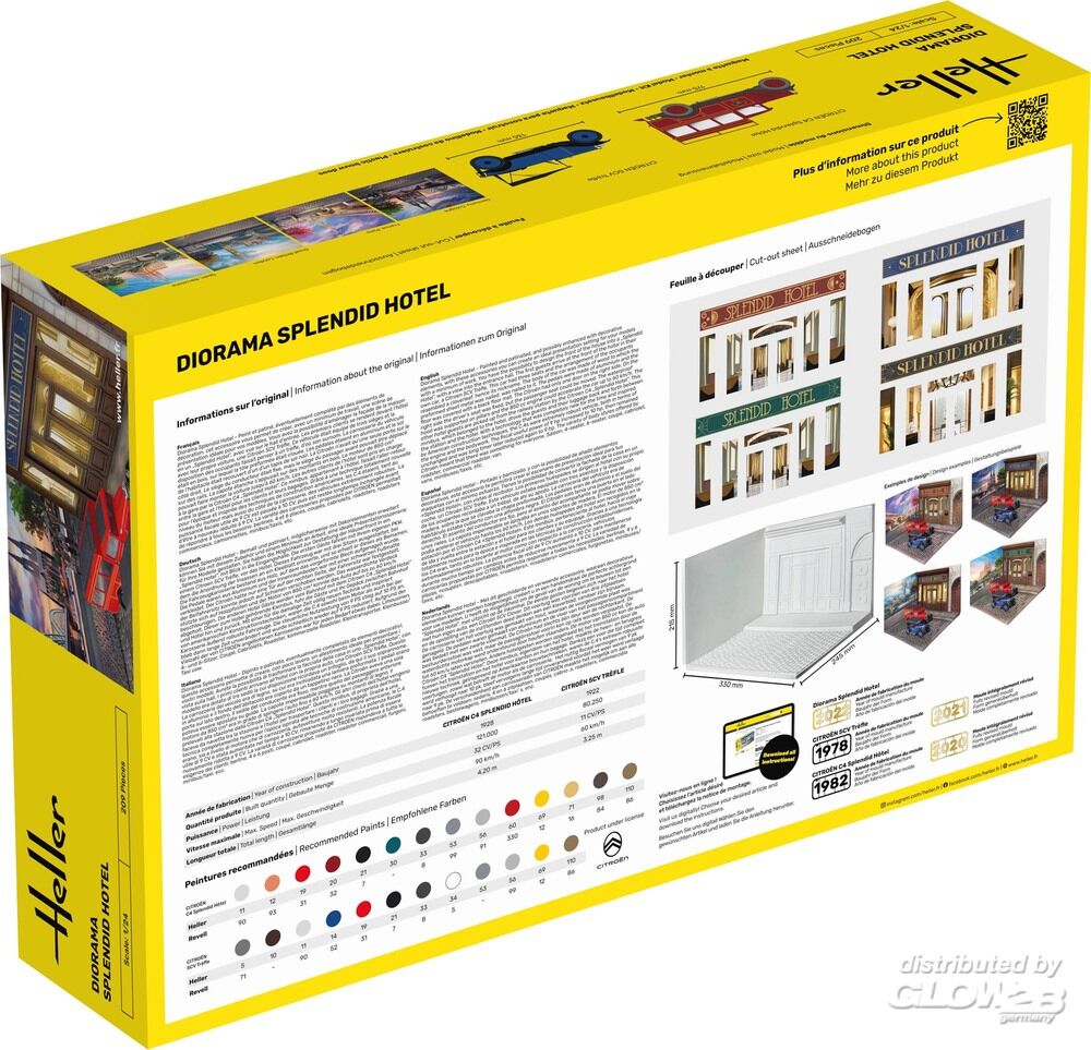 Diorama Splendid Hotel - Bemalt und patiniert, möglicherweise mit Dekorelementen erweitert können Sie mit diesem Zubehör und einem Minimum an Arbeit, eine ideale Präsentationsszenerie für Ihre Modelle gestalten. Sie haben die Möglichkeit zur Gestaltung der Häuserfront in ein „Splendid Hotel“, mit Blick in die Eingangshalle. Die ersten Gäste fahren mit Ihrem eigenen PKW, einem Citroen 5CV Trèfle, vor das Hotel. Dieses Fahrzeug war mit drei Sitzen ausgestattet, bei dem die Anordnung der Insassen an ein Kleeblatt erinnerte, und so erhielt er dieses als Beinamen. Die Fahrzeugkarosserie bestand aus Holz, auf dem das vorgeformte Blech aufgenagelt wurde. Die Pedale waren aus Aluminium und der Innenraumboden war mit einer schwarzen Fußmatte verkleidet. Der Citroën hatte nur eine Tür auf der rechten Seite, der Fahrersitz war festgestellt, der Beifahrersitz konnte jedoch auf Schienen verschoben werden. Das wasserdichte Verdeck stützte sich auf Holzpfosten und der Motor von 850 cm³ konnte das Auto auf bis zu 60 km/h beschleunigen. Die anderen Hotel Gäste werden vom Bahnhof mit dem Citroen C4 „Splendid Hotel“ abgeholt. Dieser zum Hotel gehörende Kleinbus, fuhr die Gäste und Ihr Gepäck zwischen Bahnhof und Hotel hin und zurück. Mit einer für die damalige Zeit völlig neuen Technik und inspiriert von amerikanischen Konstruktionstechniken, waren die C.4 sowohl beim Motor als auch bei der Karosserie äußerst robuste Fahrzeuge. Die steuerliche Nutzleistung von 9 PS stieg auf 10 PS an, blieb dann lange Zeit unverändert und wurde schließlich wieder auf 9 PS reduziert. Aufgrund der Vielzahl der von CITROËN angebotenen Karosserien war für jeden Bedarf etwas dabei: Limousinen, 4- und 6-Sitzer, Coupé, Cabriolets, Roadster, kommerzielle Roadster, Kleintransporter, Kleinbusse/Taxi usw. Zusatzinformationen