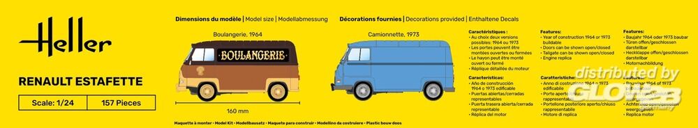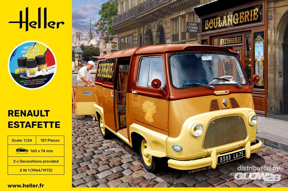 (mit Pinsel, Farbe, Kleber) • 2 IN 1: Baujahr 1964 oder 1973 baubar • Türen offen/geschlossen darstellbar • Heckklappe offen/geschlossen darstellbar • Motornachbildung Es wird oft angenommen, dass der Renault 4 (Ref. Heller 80759), der 1961 auf den Markt kam, das erste Auto mit Vorderradantrieb von Renault war. Dies ist nicht der Fall. Es war das Nutzfahrzeug Renault Estafette aus dem Jahr 1959. Die französischen Konkurrenten waren zu dieser Zeit der Peugeot D3A/D4B und der Citroën Typ H (Ref. Heller 80768). Die Estafette basierte auf dem Frontantriebssystem des Citroën, das somit eine große, flache Ladefläche, vier Einzelradaufhängungen, eine seitliche Schiebetür und eine dreiflügelige Hecktür bot. Zusatzinformationen