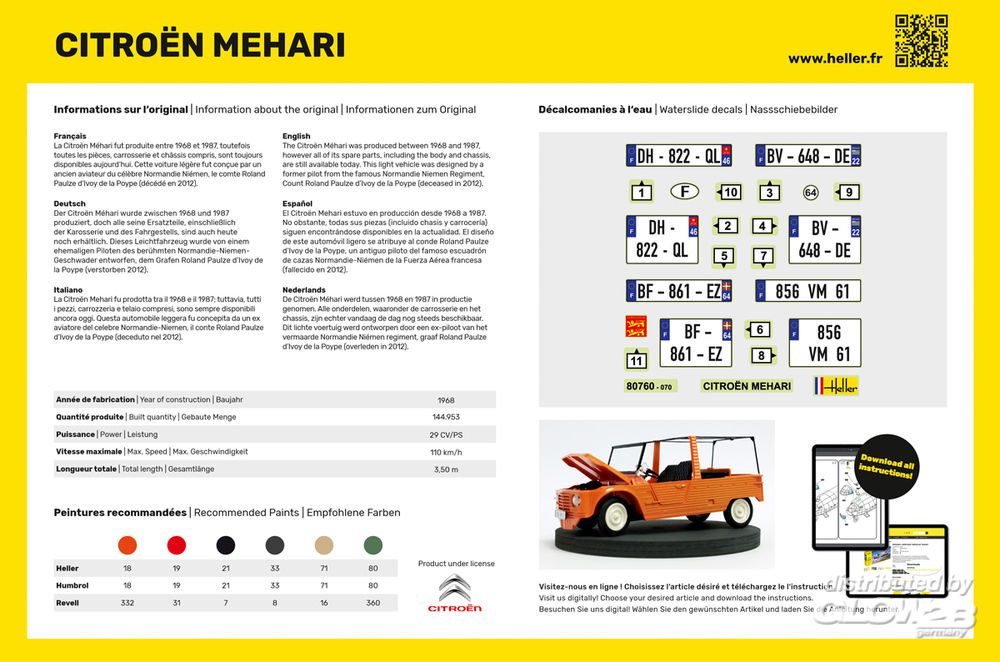 Der Citroën Méhari wurde zwischen 1968 und 1987 produziert, doch alle seine Ersatzteile, einschließlich der Karosserie und des Fahrgestells, sind auch heute noch erhältlich. Dieses Leichtfahrzeug wurde von einem ehemaligen Piloten des berühmten Normandie-Niemen-Geschwader entworfen, dem Grafen Roland Paulze d’Ivoy de la Poype (verstorben 2012).
