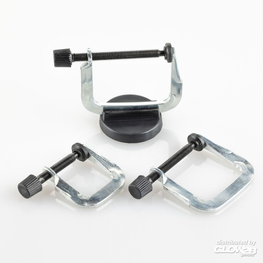 Schraubzwingen-Set mit Kunststoffgriffen für präzise Arbeiten. Mit Magnetfuß als Mini-Schraubstock zu verwenden. Enthaltene Größen: 20 mm, 30 mm und 35 mm.