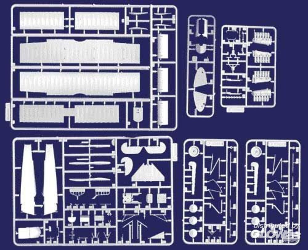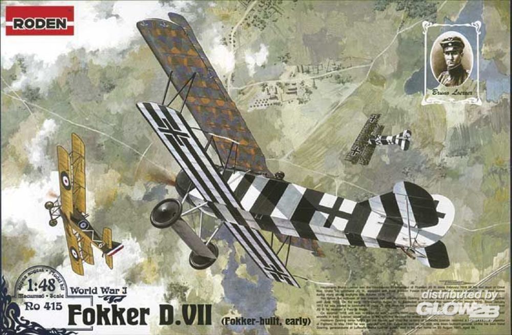 Mit sehr filigranem Cockpit, Motor und Streben. 2 Motoren und 3 Propeller enthalten, Decals für 3 Markierungen: Bruno Loerzer, Jasta 26, 1918, Hugo Sch?fer, Jasta 15, 1918, Rudolf Berthold, Jasta 15, 1918. Mit Tarnstoff (Lozengetarnung) als Decals. Der Fokker DVII gilt als das beste deutsche Jagdflugzeug des 1. Weltkrieges. Die Auslieferung "aller Maschinen vom Typ D VII" wurde von den Siegermächten daher verlangt. Fokker D VII sind unter anderem erhalten im Musee de`l Air in Paris und im Deutschen Museum in Schleißheim.