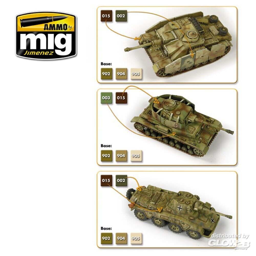 1 x ACRYLIC COLOR RAL 6011 Resedagrün (A.MIG-0003) 1 x ACRYLIC COLOR RAL 8017 Schokobraun (A.MIG-0015) 1 x ACRYLIC COLOR Dunkelgelb Base (A.MIG-0902) 1 x ACRYLIC COLOR Dunkelgelb Highlight (A.MIG-0904) 1 x ACRYLIC COLOR Dunkelgelb Shine (A.MIG-0905) Zusatzinformationen