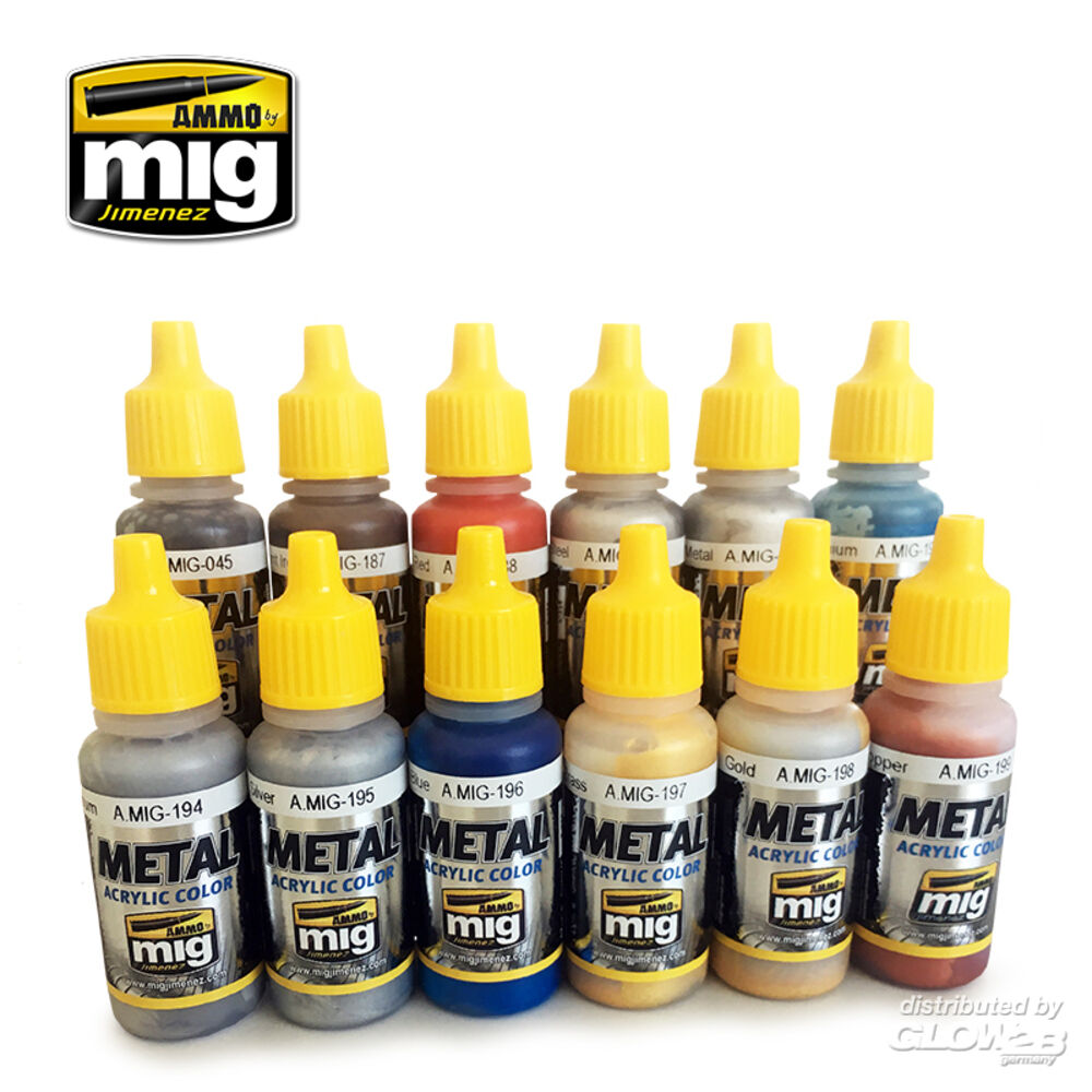 1 x METALLIC Steel (A.MIG-0191) 1 x METALLIC Matt Aluminium (A.MIG-0194) 1 x METALLIC Polished Metal (A.MIG-0192) 1 x METALLIC Silver (A.MIG-0195) 1 x METALLIC Brass (A.MIG-0197) 1 x METALLIC Jet Exhaust Burnt Iron (A.MIG-0187) 1 x METALLIC Bluish Titanium (A.MIG-0193) 1 x METALLIC Gold (A.MIG-0198) 1 x METALLIC Copper (A.MIG-0199) 1 x METALLIC Warhead Metallic Blue (A.MIG-0196) 1 x METALLIC Red (A.MIG-0188) Zusatzinformationen