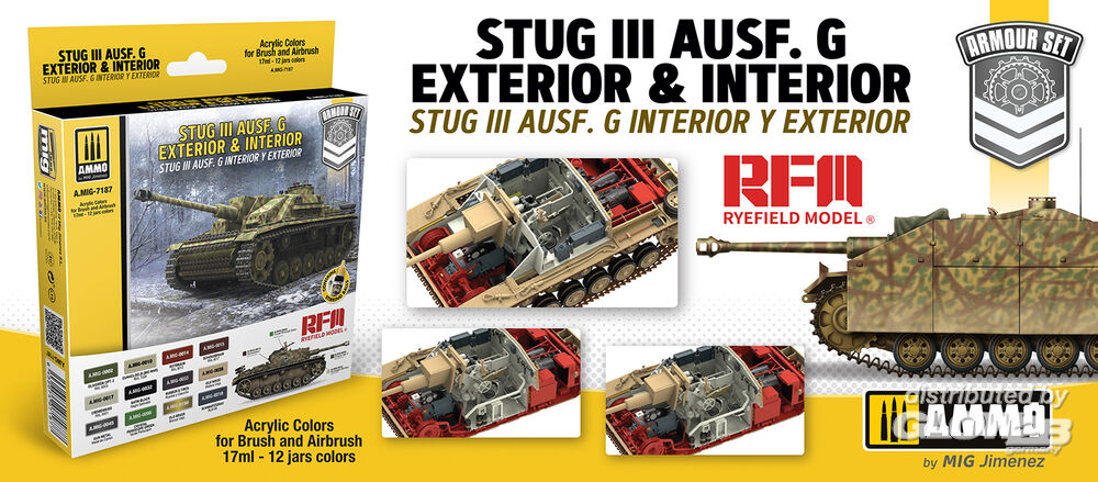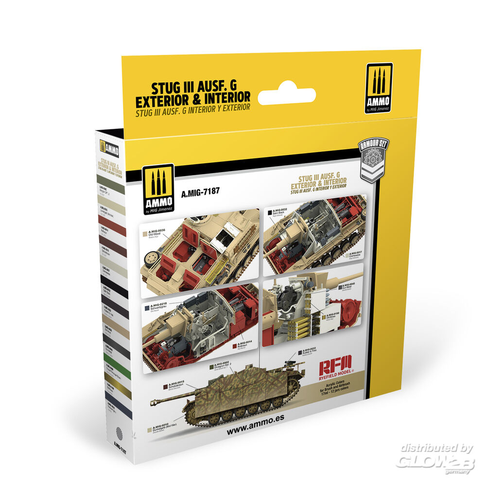 1 x ACRYLIC COLOR Rubber & Tires (A.MIG-0033) 1 x ACRYLIC COLOR RAL 8012 Rotbraun (A.MIG-0014) 1 x ACRYLIC COLOR RAL 7028 Dunkelgelb (Mid War) (A.MIG-0010) 1 x ACRYLIC COLOR RAL 6003 Olivgrün Opt. 2 (A.MIG-0002) 1 x ACRYLIC COLOR RAL 8017 Schokobraun (A.MIG-0015) 1 x ACRYLIC COLOR RAL 9001 Cremeweiss (A.MIG-0017) 1 x METALLIC Old Brass (A.MIG-0190) 1 x ACRYLIC COLOR RLM 66 Schwartzgrau (A.MIG-0218) 1 x CRYSTAL Green Periscope (and Tail Light On) (A.MIG-0096) 1 x METALLIC Gun Metal (A.MIG-0045) 1 x ACRYLIC COLOR Old Wood (A.MIG-0036) Zusatzinformationen