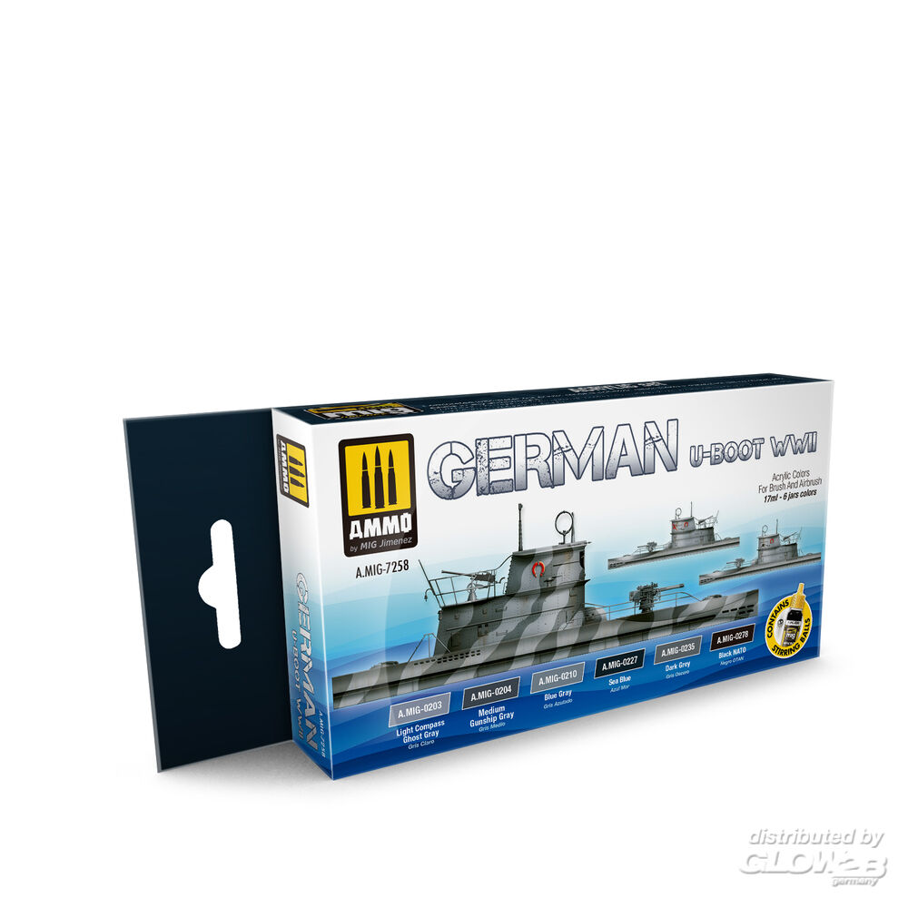 1 x ACRYLIC COLOR FS-36118 Medium Gunship Gray (A.MIG-0204) 1 x ACRYLIC COLOR FS-35237 Blue Gray AMT-11 (A.MIG-0210) 1 x ACRYLIC COLOR FS-25042 Sea Blue (ANA 606) (A.MIG-0227) 1 x ACRYLIC COLOR FS-36152 Dark Grey AMT-12 (A.MIG-0235) 1 x ACRYLIC COLOR NATO Black (A.MIG-0278) Zusatzinformationen