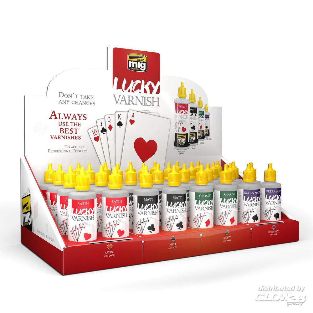 8 x LUCKY VARNISH Matt (60mL) (A.MIG-2051 / Glow2B 2074020516) 8 x LUCKY VARNISH Satin (60mL) (A.MIG-2052 / Glow2B 2074020523) 8 x LUCKY VARNISH Glossy (60mL) (A.MIG-2053 / Glow2B 2074020530) Zusatzinformationen