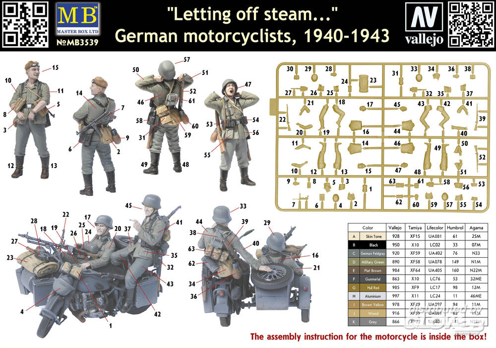 4 unbemalte Figurenbausätze und ein Bausatz für ein Motorradgespann, Typ BMW R75 mit Ausrüstung. Das Motorradgespann ist wahlweise baubar in 5 Markierungsvarianten: 12. SS-Panzer-Division Hitlerjugend, Kommandant Kurt "Panzer" Meyer, Normandie, Juni 1944, Panzergrau, Ramcke Brigade, Lybien und Tunesien, Afrikakorps, 1942-43, 14. Fallschirmjäger-Division, anzio, Italien, Januar 1944, 24. Panzer-Division, Stalingrad, russland, Herbst 1942. Mit Bonus-Decals für die 24. Panzer-Division, Stalingrad.
