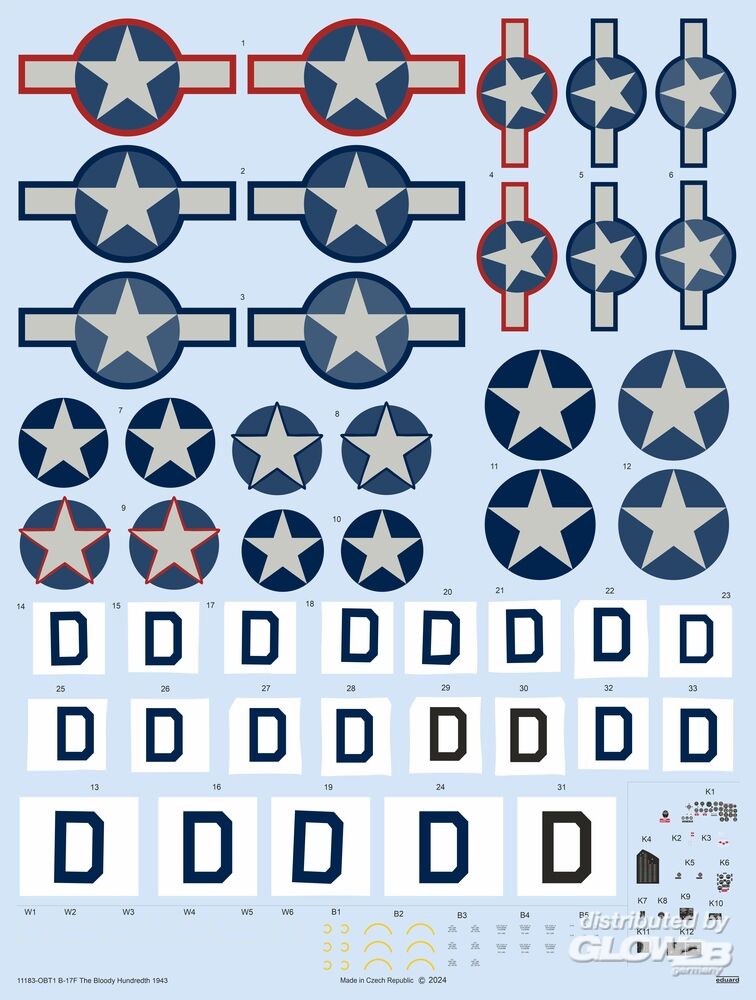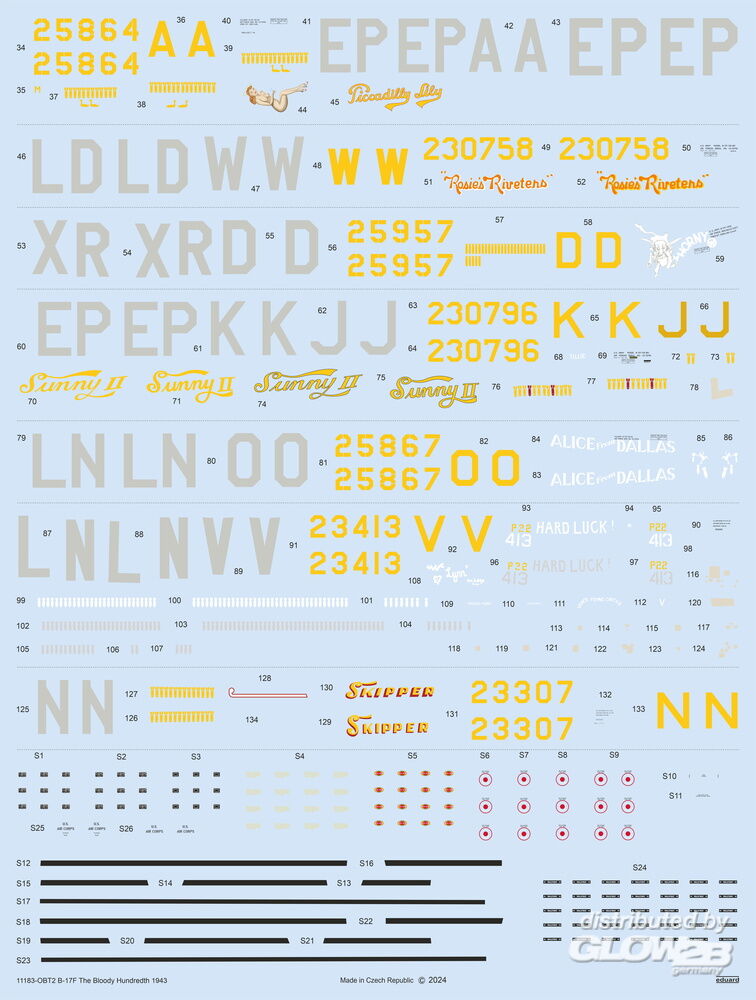 - Extra Spritzling für 2 alternative B-17F Bugvarianten, inklusive Astrodome und Wangenkanonenfenster, entwickelt in Zusammenarbeit mit HK Models nach Eduard Design. - Neue Form, erste Veröffentlichung. - Fotogeätzte Details (Armaturenbrett, kleine Cockpitdetails, Sicherheitsgurte, Motordetails und Kanonenscheiben) und gestanzte Masken. - Eduard Brassin B-17F Auspuffanlagen und Kompressoren. - Abziehbilderbogen mit 7 Markierungen von B-17Fs der 100th Bomb Group aus den Jahren 1943 bis 1944. - Diese Ausgabe unterstützt die Museums- und Bildungsprojekte der 100th BG Foundation. Zusatzinformationen