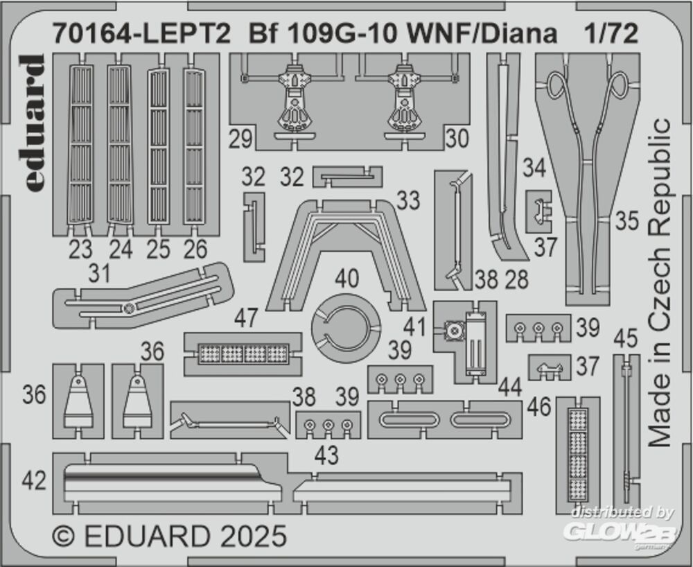 ProfiPACK edition kit of German WWII fighter aircraft Bf 109G-10 in 1/48 scale. The kit is focused on 109s produced by Wiener Neustädter Flugzeugwerke/Diana. - plastic parts: Eduard - marking options: 6 - decals: Eduard - PE parts: yes, pre-painted