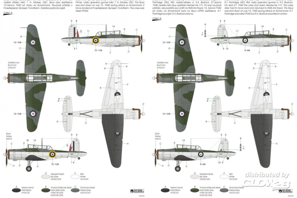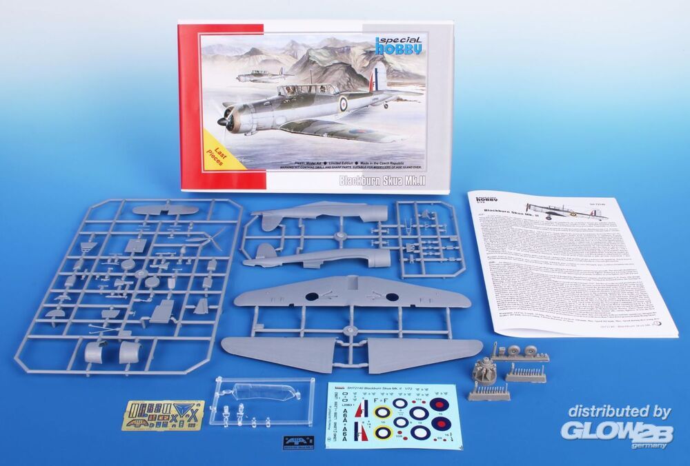 Nach dem damaligen britischen Konzept war ein trägergestützter Jäger ein Zweisitzer, ausgelegt für lange Einsatzflüge und den Kampf gegen feindliche Aufklärungsflugzeuge. Ein Einsatz gegen feindliche Bomber oder gar Jäger war nicht vorgesehen. Das vom Chefkonstrukteur der Firma Blackburn, Ing. G. E. Petty, entwickelte B.24-Projekt wurde als das beste ausgewählt. Petty entwarf ein Tiefdecker-Flugzeug aus Metall mit einklappbaren Tragflächen und einziehbarem Fahrwerk. Unter dem Rumpf befanden sich ein Fanghaken sowie eine Bombeinbuchtung für eine Bombe von bis zu 226 kg. Der erste Prototyp, später Skua Mk.I genannt, startete am 9. Februar 1937 zum Erstflug. Nach erfolgreichen Tests begann sofort die Serienproduktion. Die Serienmaschinen wurden von Bristol Perseus XII-Motoren angetrieben und als Skua Mk.II bezeichnet. Sie wurden an die Jagdgeschwader Nr. 800, 801, 803 und 806 geliefert und auch in Schul- und Zielschleppstaffeln eingesetzt. Trotz der eiligen Produktion galten die Flugzeuge in der Rolle als Jäger bereits als veraltet. Mit dem Ausbruch des Zweiten Weltkriegs kamen die Skuas jedoch sofort zum Einsatz – sowohl von Flugzeugträgern als auch von Landbasen aus. Beim ersten Bombenangriff auf ein deutsches U-Boot am 14. September 1939 gingen zwei Skuas einer dreimaschinigen Formation durch mangelhafte Bombenqualität verloren. Am 26. September schossen zwei Flugzeuge des No. 803 Squadron ein feindliches Dornier Do 18-Flugboot ab – der erste bestätigte britische Luftsieg des Zweiten Weltkriegs. Die Skua ist zudem mit mehreren weiteren „Premieren“ verbunden. Während des Norwegenfeldzugs am 10. April 1940 versenkten sechzehn Skuas den deutschen Kreuzer Königsberg. Das Geschwader No. 800 unter dem Kommando von Capt. R. T. Partridge und No. 803 unter Lt. W. P. Lucy starteten von Hatston auf den Orkney-Inseln – dies war der erste erfolgreiche Luftangriff auf ein Kriegsschiff im Zweiten Weltkrieg. Skuas nahmen auch an der Schlacht von Dünkirchen teil und kämpften an Bord der HMS Ark Royal im Mittelmeerraum. Dort kam es am 3. Juli 1940 zu einem weiteren historischen Ereignis: Eine Skua der Ark Royal kämpfte gegen französische Flugzeuge – das erste britische Flugzeug, das gegen frühere Verbündete kämpfte, und zugleich das erste, das in diesem nicht erklärten Krieg verloren ging. Die letzten Skuas wurden im April 1941 von der HMS Ark Royal abgezogen und dienten danach nur noch in Nichtkampfeinheiten. Ihre Kampflaufbahn war relativ kurz, doch trotz der begrenzten Leistungsfähigkeit als Jäger erzielten mehrere Piloten auf ihnen mehr als fünf Abschüsse. Als Bomber hätten sie deutlich erfolgreicher sein können, wurden jedoch von der Admiralty nicht angemessen eingesetzt – zum Nachteil der Royal Navy. Das Modell kehrt nach mehreren Jahren wieder ins Sortiment zurück. Zwei Spritzrahmen aus grauem Kunststoff werden ergänzt durch einen Rahmen mit Klarsichtteilen, Fotoätzteile und detaillierte PUR-Komponenten. Die Decals bieten Markierungen für drei Flugzeuge im FAA-Tarnschema. Zusatzinformationen