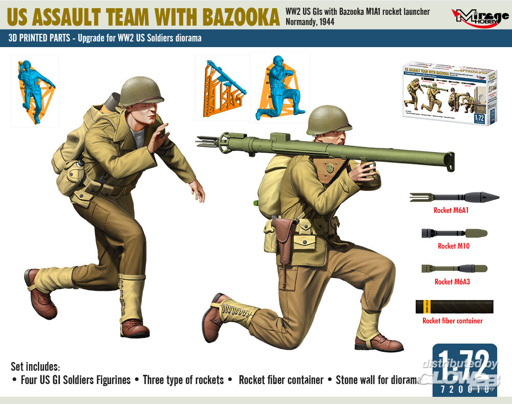 Mirage Hobby: US ASSAULT TEAM WITH BAZOOKA, WW2 US GIs with Bazooka M1A1 rocket launcher Normandy, 1944 in 1:72 [4072010]