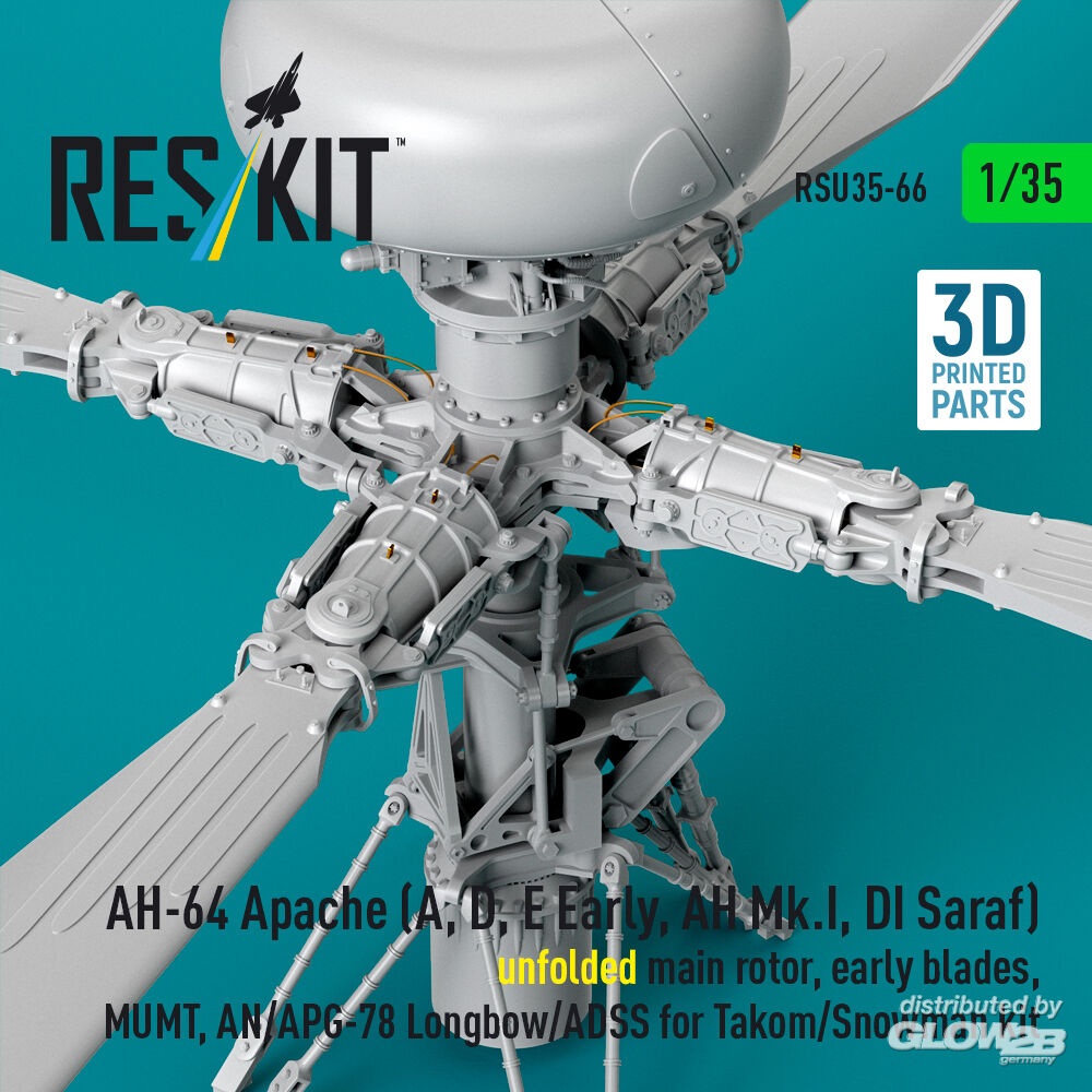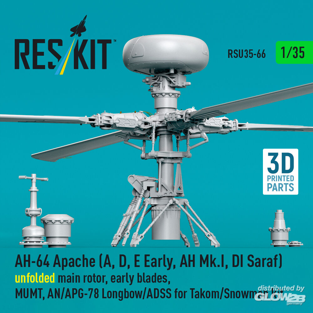 RESKIT Models: AH-64 Apache (A, D, E Early, AH Mk.I, DI Saraf) unfolded main rotor, early blades, MUMT, AN/APG-78 Longbow/ADSS for Takom/Snowman kit (3D Printed) in 1:35 [4592200664]