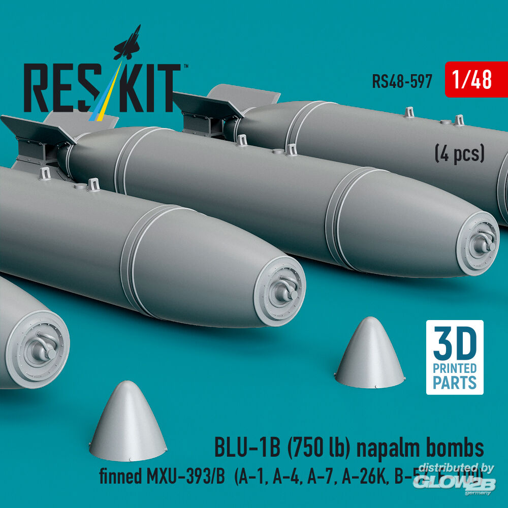 ResKit Models: BLU-1B (750 lb) napalm bombs finned MXU-393/B (4 pcs) (A-1, A-4, A-7, A-26K, B-57, F-100) (3D Printed) in 1:48 [4594105974]