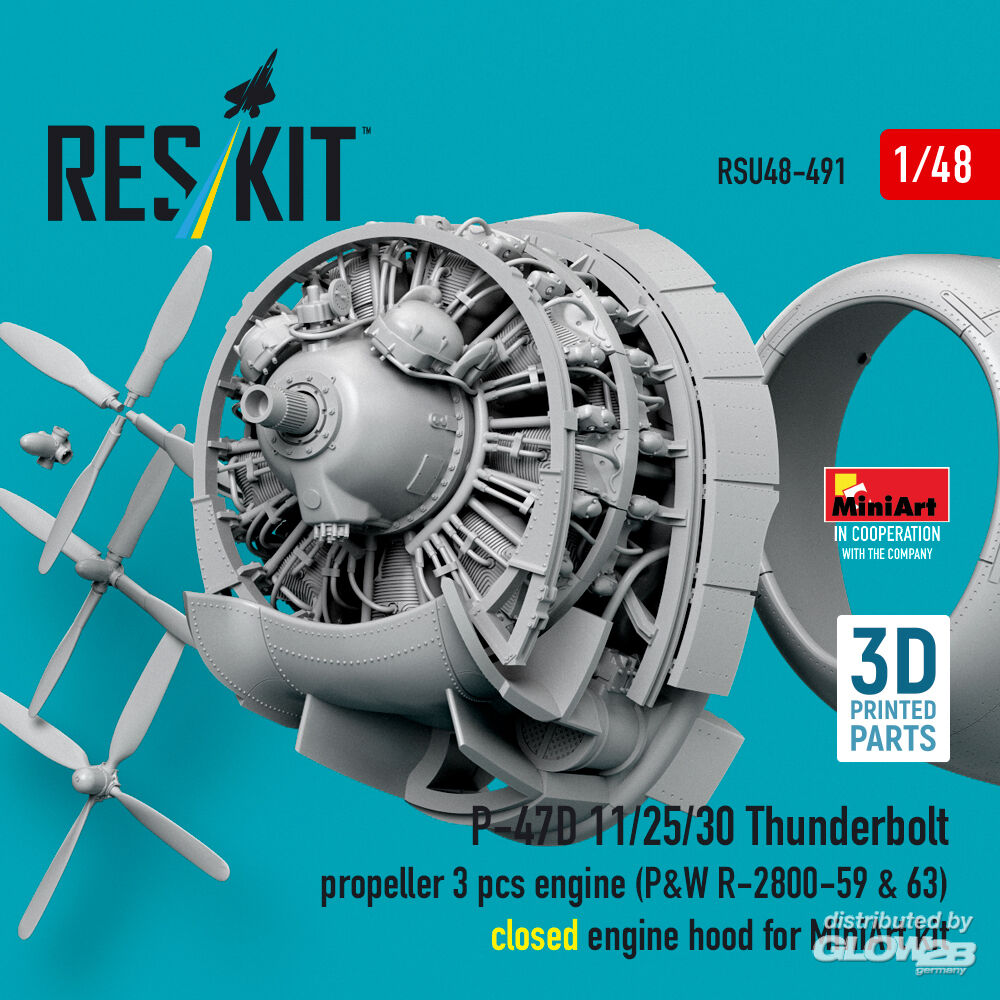 ResKit Models: P-47D 11/25/30 Thunderbolt propeller (3 pcs), engine (P&W R-2800-59 & 63) closed engine hood for MiniArt kit (3D Printed) in 1:48 [4594204912]