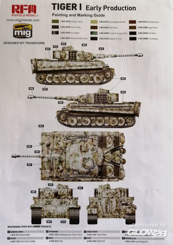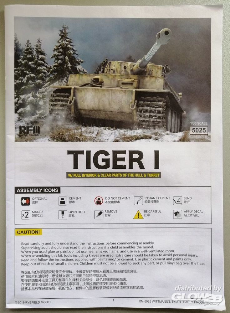 - No. S04, sPzAbt 101, Russia, January 1944 - No. 1331, 1st Panzer Division 1943 mit detailliertem Interior, Ätzteilen, Draht als Abschleppseil, Decals, Einzelglieder Ketten und Klarteilen. Der Turm und die Abdeckung des Innenraums kann wahlweise auch mit klarem Kunststoff gebaut werden, so daß die komplette Inneneinrichtung gesehen werden kann. Tiger I - No. S04, sPzAbt 101, Russia, January 1944 - No. 1331, 1st Panzer Division 1943 with detailed interior, etched parts, wire as tow rope, decals, workable track links chains and clear parts.The tower and the cover of the interior can be optionally built with clear plastic, so that the entire interior can be seen. Zusatzinformationen