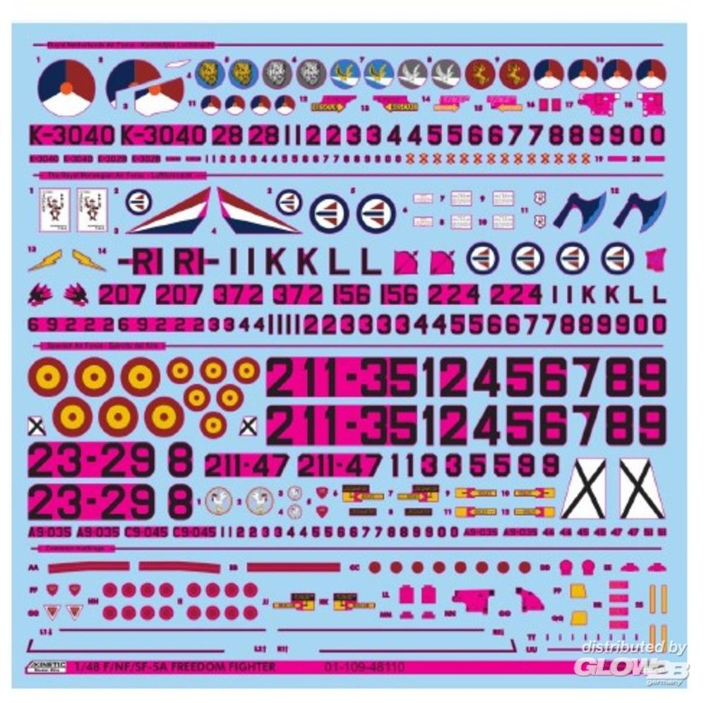 - Include Decals printed by Cartograf S.r.l., Italy - Include Photo Etched part Markings options: - Netherland Air Force NF-5A 315 Squardron 1979 - Netherland Air Force NF-5A 315 Squardron 1985 - Royal Norweygian Air Force F-5A 336 Squadron, “Flying Jokers” - Royal Norweygian Air Force F-5A 334 Squadron, 1969 - Spanish Air Force SF-5A Squadron, Moron, Spain, 1976 The Northrop F-5 is a family of supersonic light fighter aircraft initially designed as a privately funded project in the late 1950s by Northrop Corporation. There are two main models, the original F-5A and F-5B Freedom Fighter variants. The design team wrapped a small, highly aerodynamic fighter around two compact and high-thrust General Electric J85 engines, focusing on performance and a low cost of maintenance. Smaller and simpler than contemporaries such as the McDonnell Douglas F-4 Phantom II, the F-5 cost less to procure and operate, making it a popular export aircraft. Though primarily designed for a day air superiority role, the aircraft is also a capable ground-attack platform. The F-5A entered service in the early 1960s. During the Cold War, over 800 were produced through 1972 for U.S. allies. In 1986 nine aircraft were acquired by Norway, and in 1991 another ten (NF-5A/B) by the Netherlands. During the period 1967-1968 the type was used by the third Greek aerobatic flight, “New Greek Flame”. The F/NF-5A were withdrawn in 2001. Single-seat fighter version of the F-5A for the (SF-5A) Spanish Air Force, built under license in Spain by CASA. Zusatzinformationen