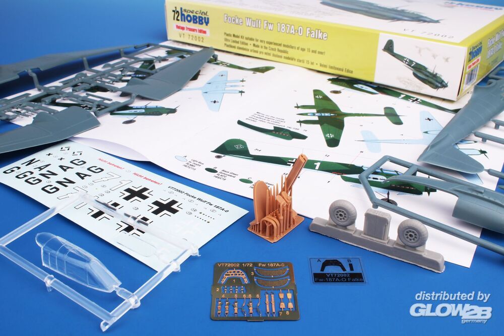 Die zweimotorige Fw 187 war ursprünglich als einsitziges, später als zweisitziges schweres Jagdflugzeug konzipiert. Ihre Leistung war der der Bf 110 überlegen, aber die Luftwaffe entschied sich gegen den Einsatz des Typs, vor allem wegen der fehlenden Heckfeuerabwehrbewaffnung. Die bereits produzierten Maschinen wurden getestet und dann an die Industrie-Schutzstaffel zur Verteidigung der Focke Wulf-Werke in Bremen abgegeben. - wirklich interessanter Typ - der Bausatz enthält auch Ätzteile, Resin-Gussteile und 3D-Druckteile Zusatzinformationen