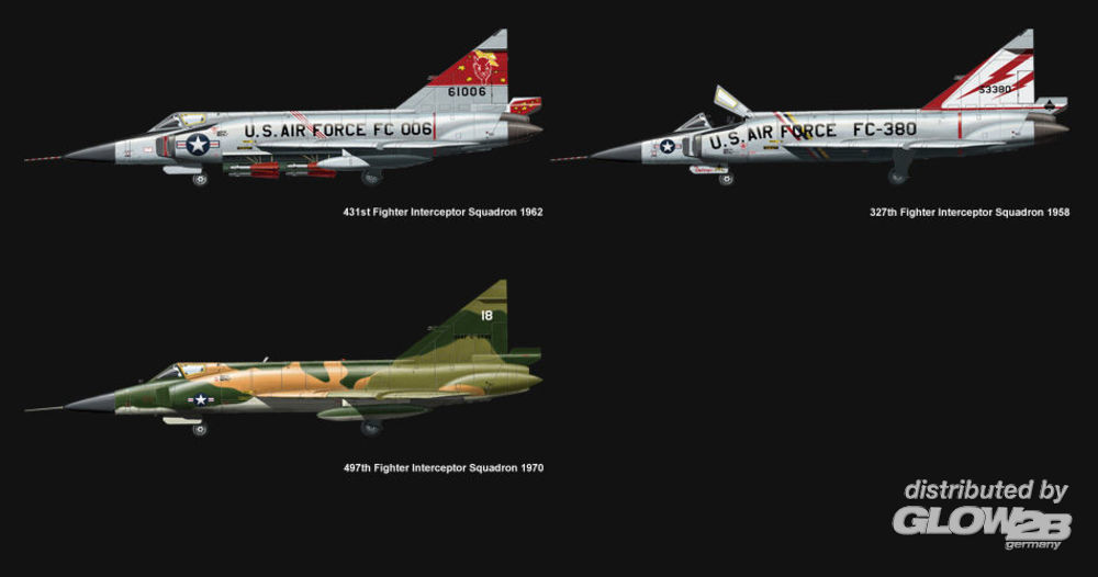 KIT INFO 1/72 scale plastic model kit of F-102A Delta Dagger is 289mm in total length and 161mm in width. It offers several strictly verified painting options, the best assembly and precise fit. The weapons bay can be built either open or closed. Built-in missile pylons are retractable. The cockpit is detailed and its canopy can also be built either open or closed. The exhaust nozzle is precise. Accurate model lines completely reproduce the perfect shape of the Area-ruled F-102A aircraft. Besides, the landing gears and airbrakes can be built either open or closed as well. Drei unterschiedliche Versionen baubar: 1) 431st Fighter Interceptor Squadron 1962 2) 327th Fighter Interceptor 1958 3) 497th Fighter Interceptor Squadron 1970 Sehr detaillierte Bauanleitung in Farbe. Zusatzinformationen