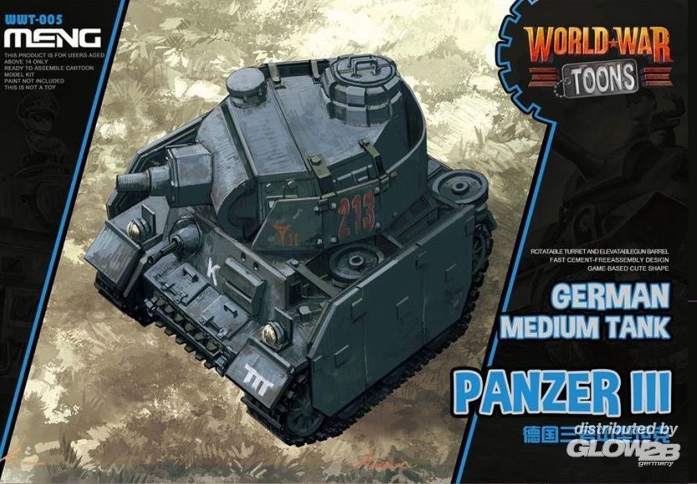 Es ist ein ideales Modell für Anfänger und auch für Modellbauer, die gerne mal was anderes bauen wollen. Das Cartoon-Spiel FPS World War Toons, das von Studio Roqovan in den USA entworfen wurde, gehört zu den Spielen der PlayStation VR-Plattform. Die Modell-Kits der WWT-Serie, die von MENG auf der Basis der Fahrzeuge im Spiel entwickelt wurden, sind bei den weltweiten Modellbauern sehr beliebt. This model doesn’t require the use of glue during assembly. It features snap-fit design and pre-colored parts. It’s the ideal choice for beginners and also for other modelers for the purpose of leisure. The cartoony FPS World War Toons game designed by Studio Roqovan in the U.S. has been among the players on the PlayStation VR platform. The WWT series plastic model kits developed by MENG based on the armors in the game have been popular among global modellers. Zusatzinformationen