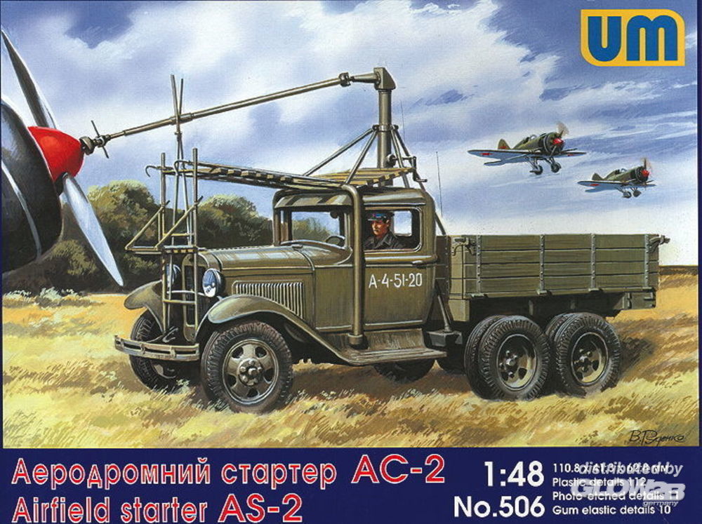 Bausatz für einen LKW GAZ-AAA mit Vorrichtung zum Anlassen von Propellermotoren bei Flugzeugen. Bausatz inklusive Gummireifen, Fotoätzsatz und bedruckter Fensterfolie.