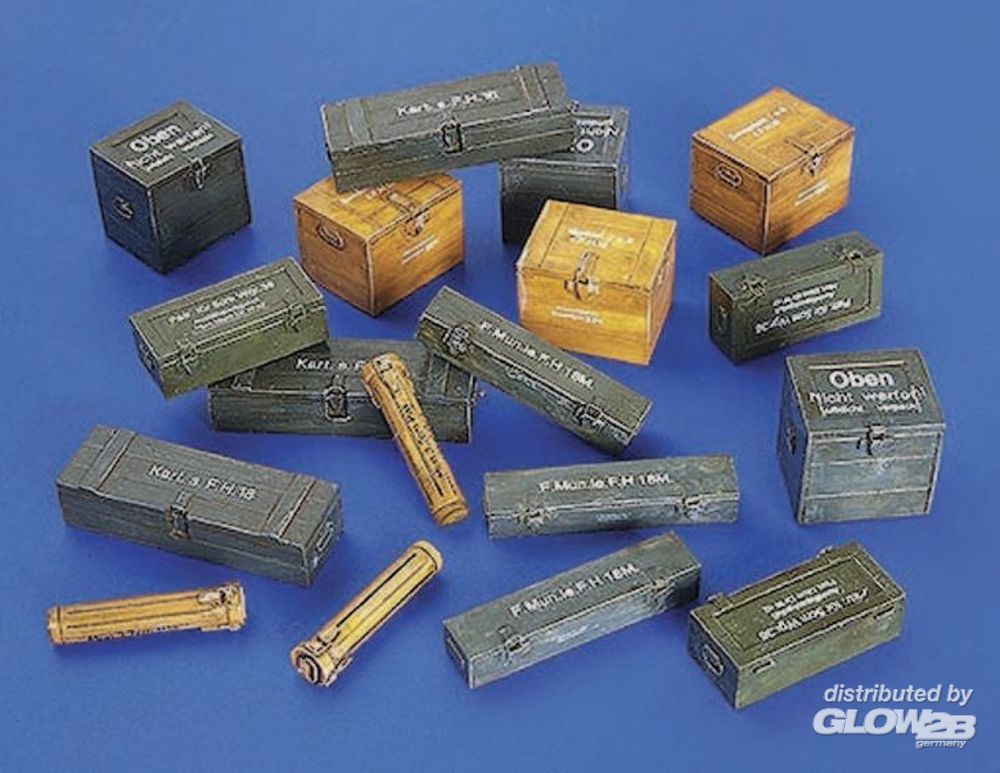 Set bestehend aus 6 unterschiedliche Munitionsboxen mit Decals. Insgesamt 18 Teile. Mit Anleitungsskizzen.