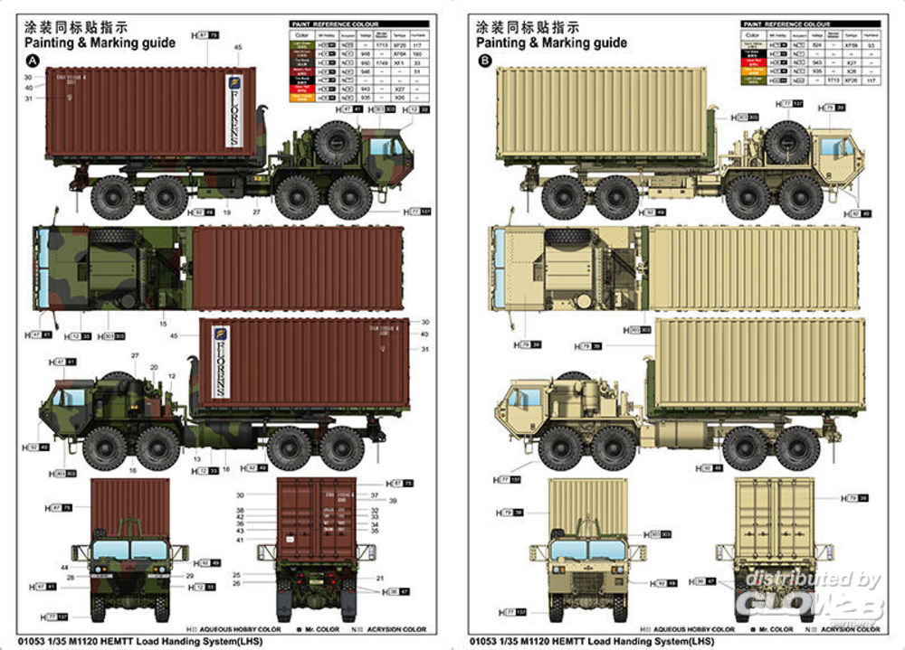 - Antriebsstrang komplett mit Motorgetriebe, Differentialgehäuse und Federung. - Die Reifen sind Hohlgummi mit sehr gutem Profil - Die Windschutzscheibe und die Seitenfenster bestehen aus klaren Teilen - Fotoätzteile enthalten - Container enthalten Detailed cab. > Full drive train assembly complete with engine transmission, differential housing and suspension units. > The main tires are hollow rubber with very good tread pattern > The windshield and side windows are made of clear parts. > Photo-etched parts included > Container included Zusatzinformationen