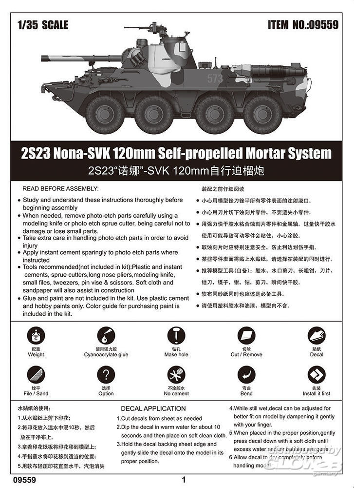 - feinen Details - Unteren Rumpf und oberen Rumpf - Gummireifen - mit Fotoätzteilen Russisches 2S23 NONA-SVK Feuerunterstützungsfahrzeug auf der Basis von extensiv modifiziertem Amphibienfahrzeug APR BTR-80 mit gezogenem Geschütz 120 mm 2A60 aus dem 2S9 NONA. Betrieben von einer Besatzung von 4 Personen. Wassergekühlter V-8-Motor. Reifenfüllsystem, Rüstungsschutz vorne und hinten. Ausgestattet mit Nachtsichtgeräten und Wärmebildgeräten. The kit consists of over 550 parts >the kit w/refined detail >multi-slide moulded turret, lower hull & upper hull >rubber tires >photo-etched parts included Russian 2S23 NONA-SVK fire support vehicle based on extensively modified BTR-80 amphibious wheeled APC with 120 mm 2A60 rifled gun/mortar from the tracked 2S9 NONA. Operated by a crew of 4. Water-cooled V-8 engine. Tyre inflation system. Armour protection front and rear. Fitted with night vision and thermal imaging devices. Zusatzinformationen